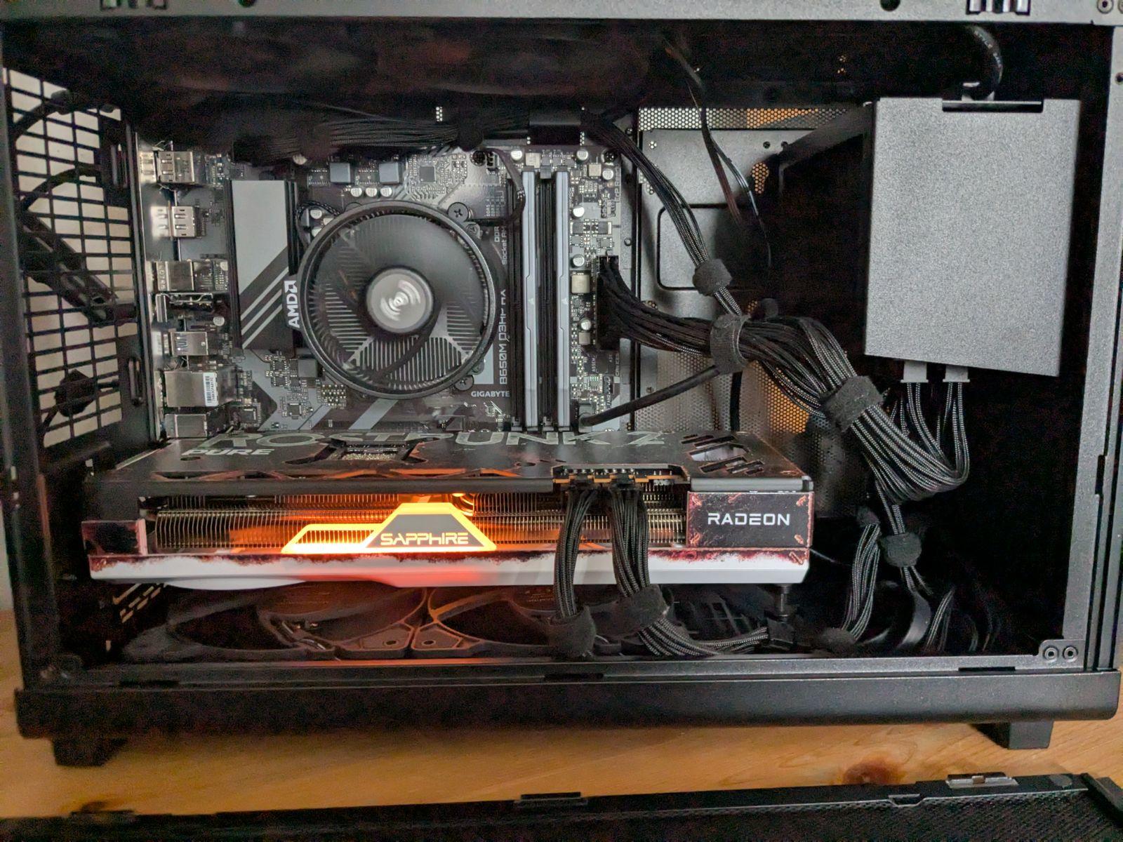 Une apparence sobre, sublimée par cette touche de bois en façade, loin de tout ce RGB extravagant. Il s’intègre parfaitement dans un environnement épuré, puisqu’il tient sur une étagère murale. L’air circule de tous les côtés. La compacité de ce boîtier n’a rien à envier aux autres formats, grâce à une capacité de refroidissement maîtrisée. Il m’a servi d’initiation au montage d’un PC : simple à prendre en main, il reste accessible à tous. L’organisation des câbles peut être le moment le plus fastidieux, car aucun emplacement n’est prévu à cet effet, mais avec quelques attaches, la tâche reste faisable.