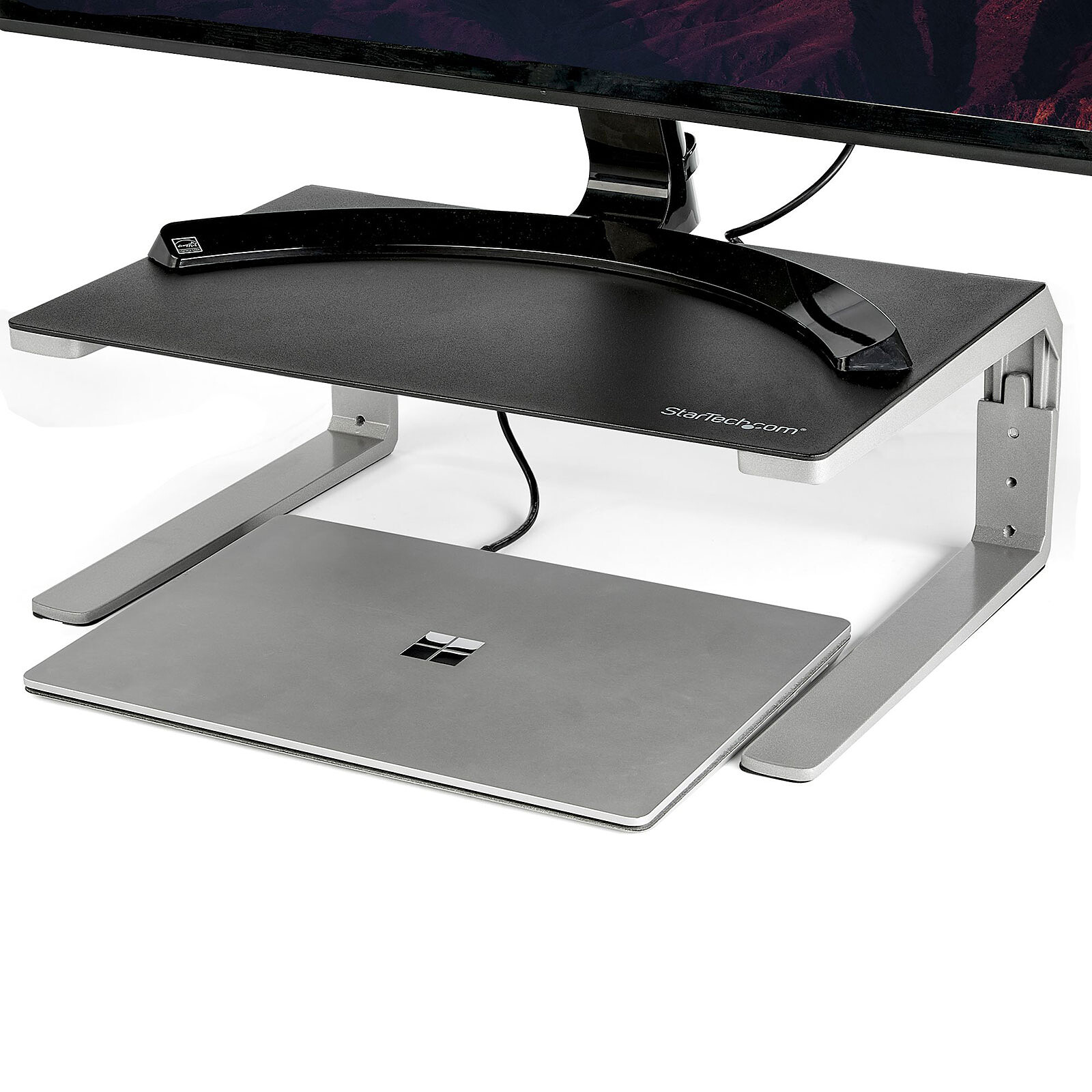 Sa hauteur (réglable) permet de voir les 2 (celui du PC et le supplémentaire), ce qui n'est pas évident avec d'autres rehausseurs.