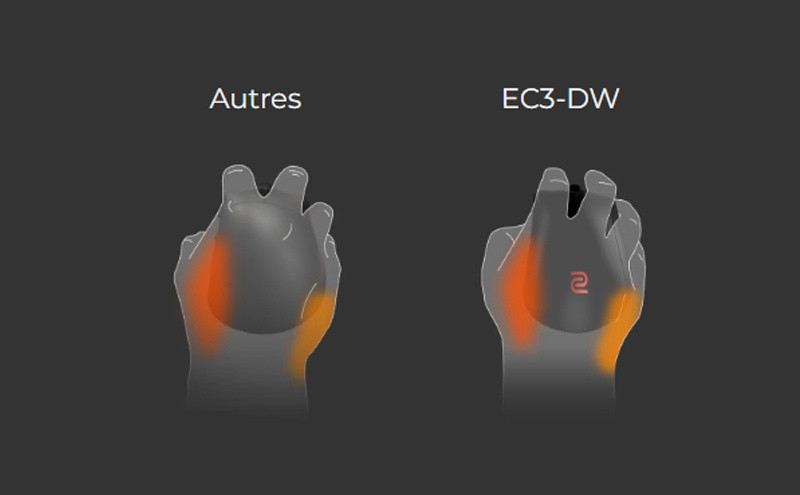 Conçue pour répondre à votre besoin, à savoir une souris adaptée à votre main, l'EC3-DW profite de la meilleure maniabilité possible et d'un confort incroyable. Ainsi, retrouvez cette forme ergonomique asymétrique si astucieuse développée par BenQ Zowie. Le design arrondi et courbé de l'EC évite toute pression gênante sur la paume, contribuant ainsi à réduire la fatigue musculaire lors d'une utilisation prolongée.
