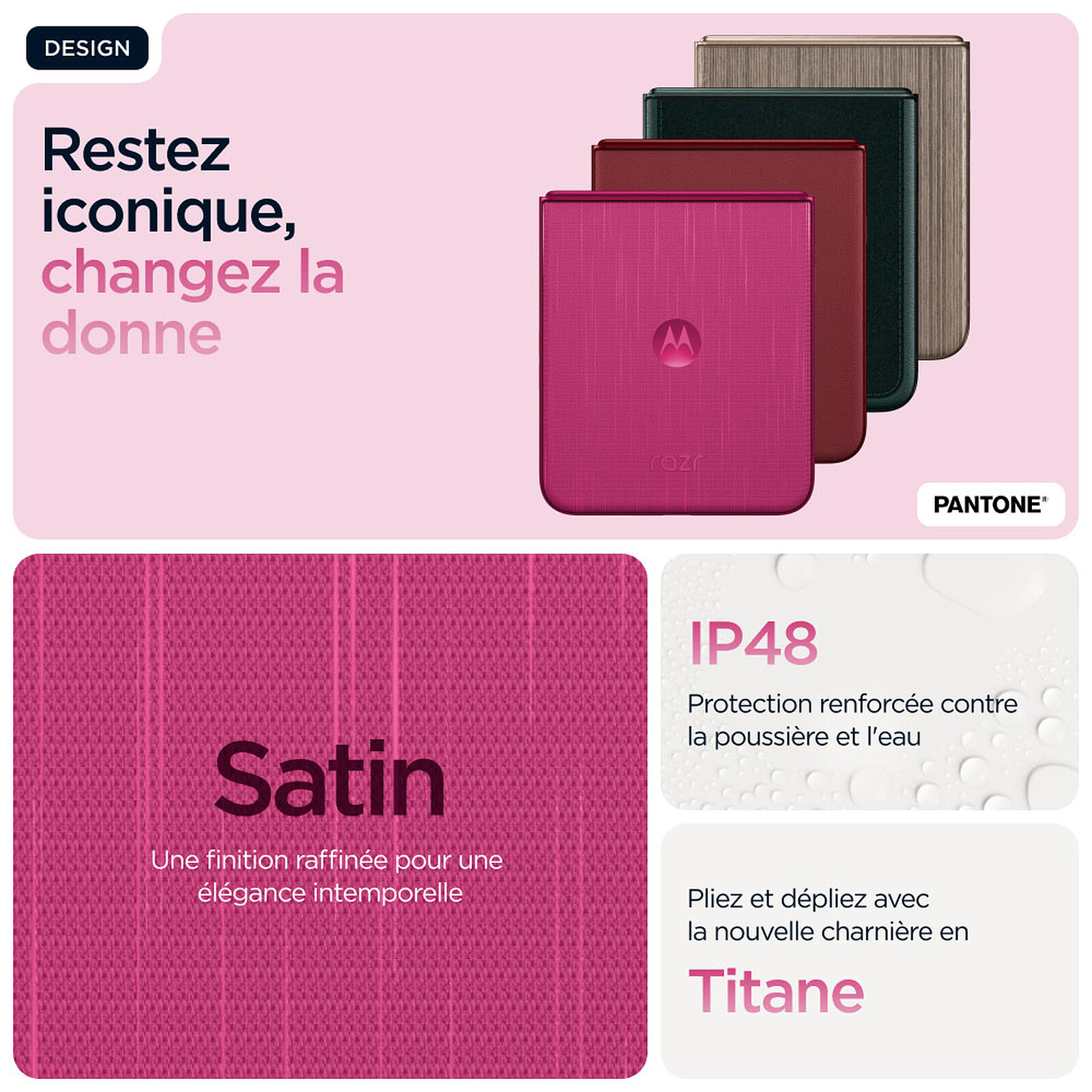 Le Motorola Razr 60 Ultra séduit par son design élégant et ses matériaux premium. Sa charnière renforcée en titane assure une robustesse à toute épreuve, capable de supporter plus de 800 000 ouvertures et fermetures. Les finitions en Alcantara, cuir végan ou bois véritable apportent une touche de sophistication unique. De plus, sa certification IP48 garantit une résistance accrue à l'eau et à la poussière, faisant de ce smartphone un compagnon fiable au quotidien.