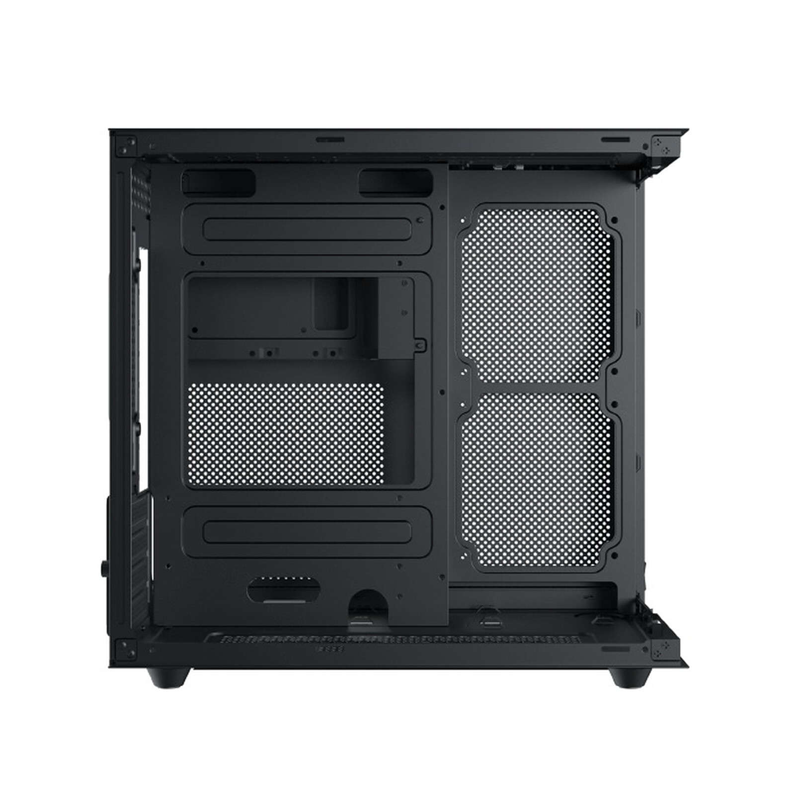 Arrière : 1 x 120 mm (1 ventilateur ARGB 120 mm fourni) Latéral : 2 x 120 mm (2 ventilateurs inversés ARGB 120 mm fournis) Dessus : 2 x 120 mm ou 2 x 140 mm (2 ventilateurs inversés ARGB 120 mm fournis) Dessous (sans cage HDD) : 2 x 120 mm |
