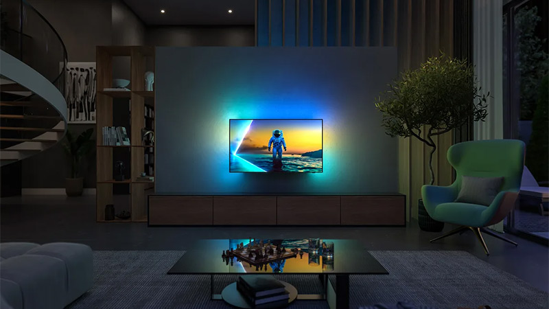 De son côté, la technologie Ambilight est présente sur 3 côtés pour une immersion complète. Elle fonctionnera en parfaite harmonie avec le contenu affiché à l'écran et pourra même être synchronisée avec le reste de votre éclairage Philips Hue.