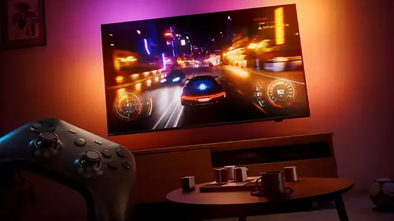 De son côté, la technologie Ambilight est présente sur 4 côtés pour une immersion complète. Elle fonctionnera en parfaite harmonie avec le contenu affiché à l'écran comme le sport, les films, la musique et les jeux. Il pourra même être synchronisée avec le reste de votre éclairage Philips Hue.