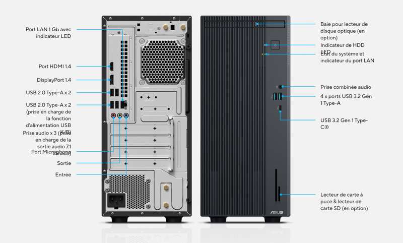 La connectique est pensée pour la polyvalence : ports USB 3.0 Type-C et Type-A en façade, HDMI, DisplayPort 1.4, Ethernet Gigabit, Wi-Fi 6 et Bluetooth 5.4. Vous pouvez facilement connecter vos périphériques, moniteurs ou accessoires sans compromis sur la vitesse ou la stabilité de connexion.