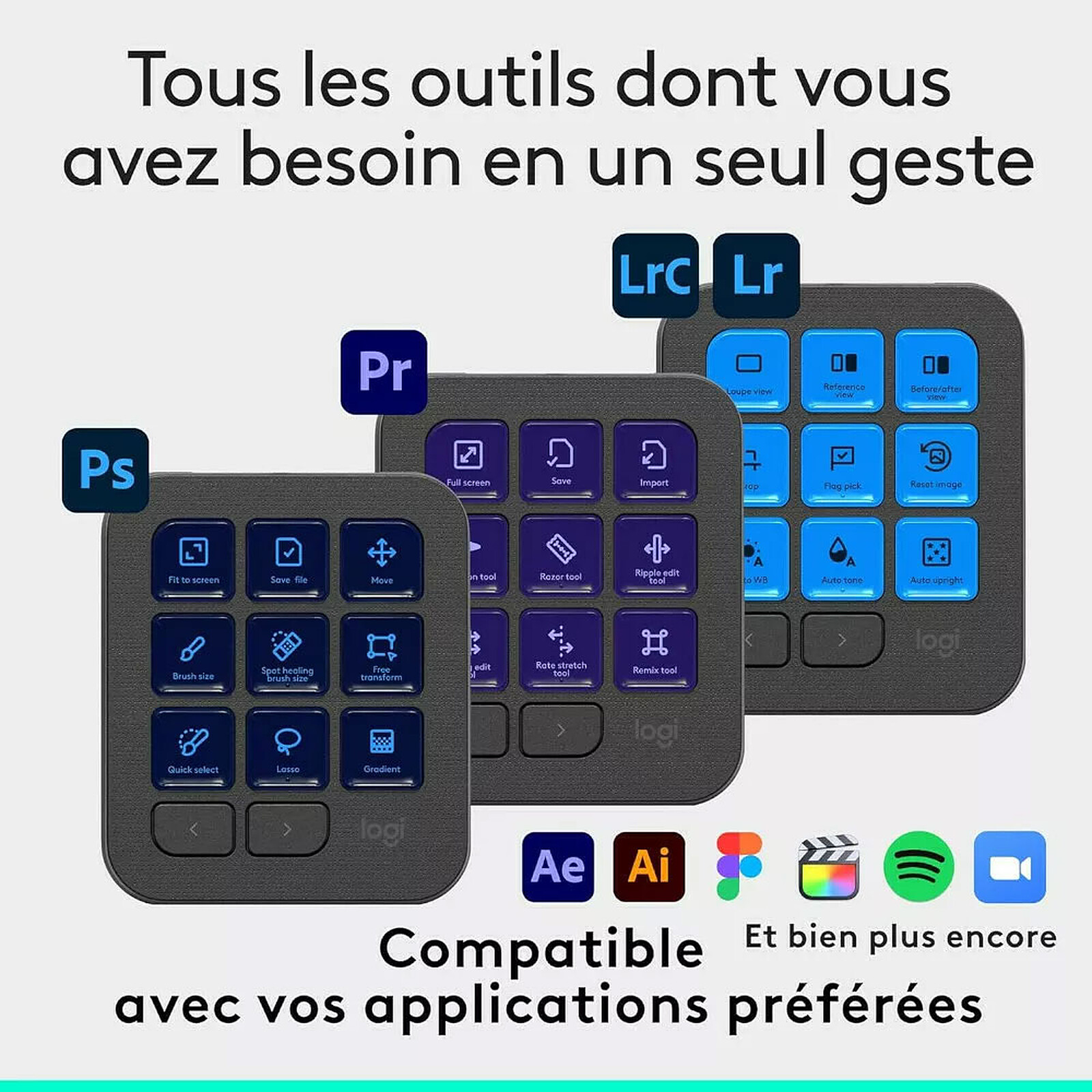 Le Keypad à touches LCD personnalisables offre un accès immédiat à vos fonctions favorites, grâce à des profils préconfigurés pour des outils comme Adobe Photoshop, Premiere Pro, Lightroom, Final Cut Pro, Figma ou DaVinci Resolve. Avec une personnalisation poussée possible via Logi Options+, vous naviguez entre vos applications et actions en toute simplicité.