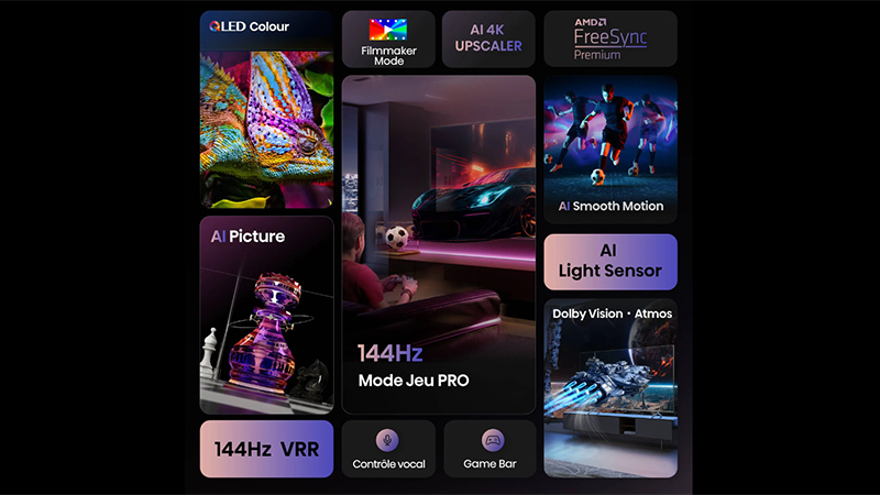- Gaming : 4x HDMI 2.1 (4K 144Hz), 4K, VRR, ALLM, Mode jeu (input lag <11 ms)