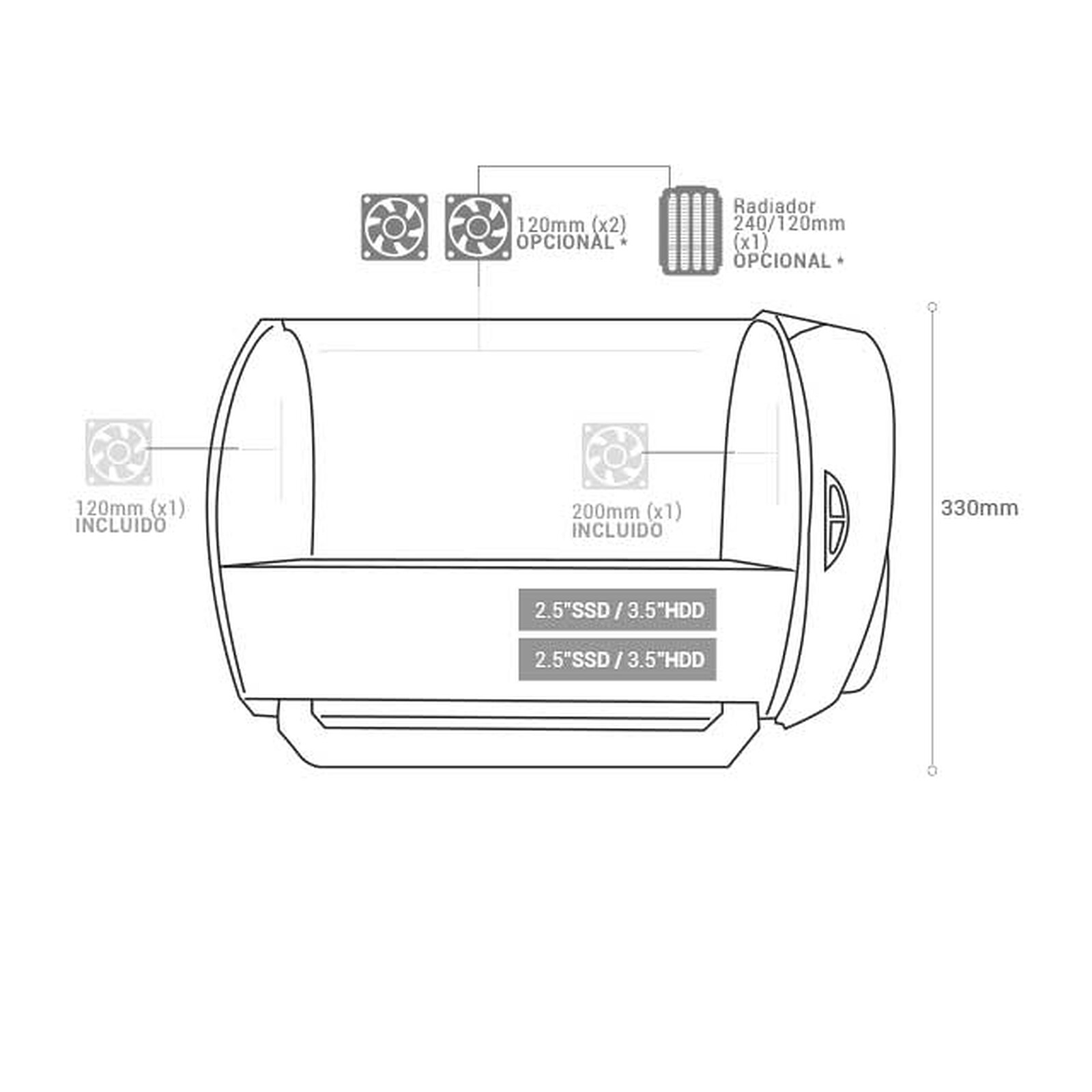 Possibilité d'ajout de 2 ventilateurs 120 mm sur le dessus ou un radiateur 120/240 mm