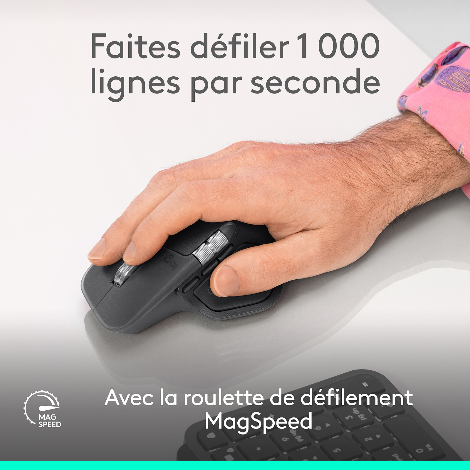 La MX Master 4 intègre la célèbre roue MagSpeed capable de faire défiler jusqu’à 1 000 lignes par seconde avec une fluidité inégalée. Vous passez sans effort du mode ultra-rapide à un défilement au pixel près, pour une navigation qui s’adapte à toutes vos tâches, du traitement de texte au montage vidéo haute précision.