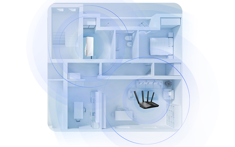 La technologie ASUS AiMesh vous permet d'utiliser facilement le RP-BE58 avec un autre routeur compatible AiMesh pour étendre la couverture de votre réseau WiFi. Vous pouvez également appliquer les fonctions complètes des routeurs ASUS connectés au réseau maillé global. En plus des appareils compatibles ASUS AiMesh, le RP-BE58 peut fonctionner avec une grande variété d'autres routeurs, modems et passerelles WiFi. Connectez le RP-BE58 à votre routeur actuel pour profiter d'un réseau WiFi étendu !