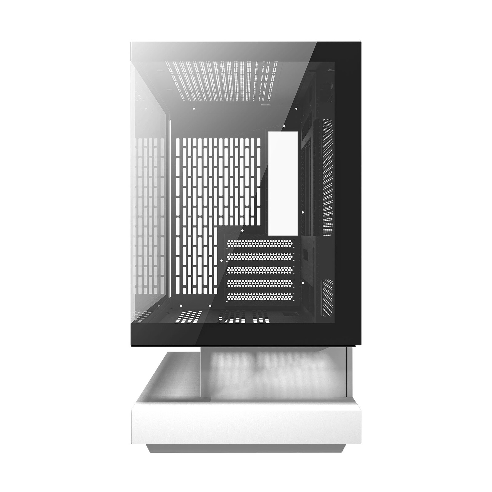 Le FLOATRON F1 est un boîtier PC au design innovant alliant esthétique futuriste et haute capacité de dissipation thermique. Conçu pour les configurations Micro-ATX et ITX, il se caractérise par sa base "flottante" qui améliore significativement le flux d’air. Il repose sur une base surélevée, créant un espace permettant à l’air de circuler librement depuis le bas et les côtés. Ce design favorise un refroidissement multidirectionnel en réduisant les risques de surchauffe et en améliorant les performances globales du système. La base sert également de plateforme d’exposition pour des éléments décoratifs ou des éclairages.