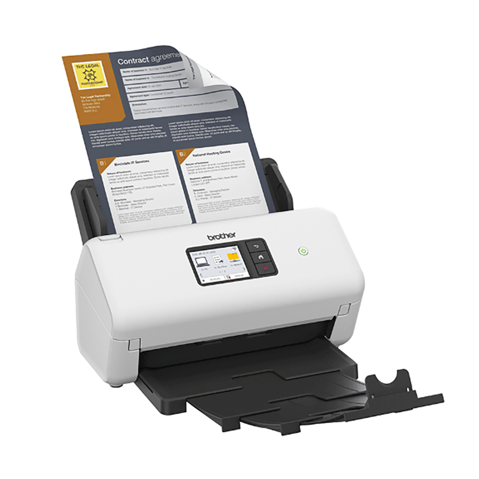 L'ADS-4550W utilise un plateau de sortie plus large pour gérer tous les types de papiers dans le chargeur. Le chargeur est incliné pour éviter tout risque de bourrage, les feuilles glissent plus facilement et sont empilées dans les meilleurs conditions. L'ADS-4550W avec son chargeur de 60 feuilles, peut numériser jusqu'à 35 ppm et supporter des grammages papiers allant de 20 à 200 g/m².