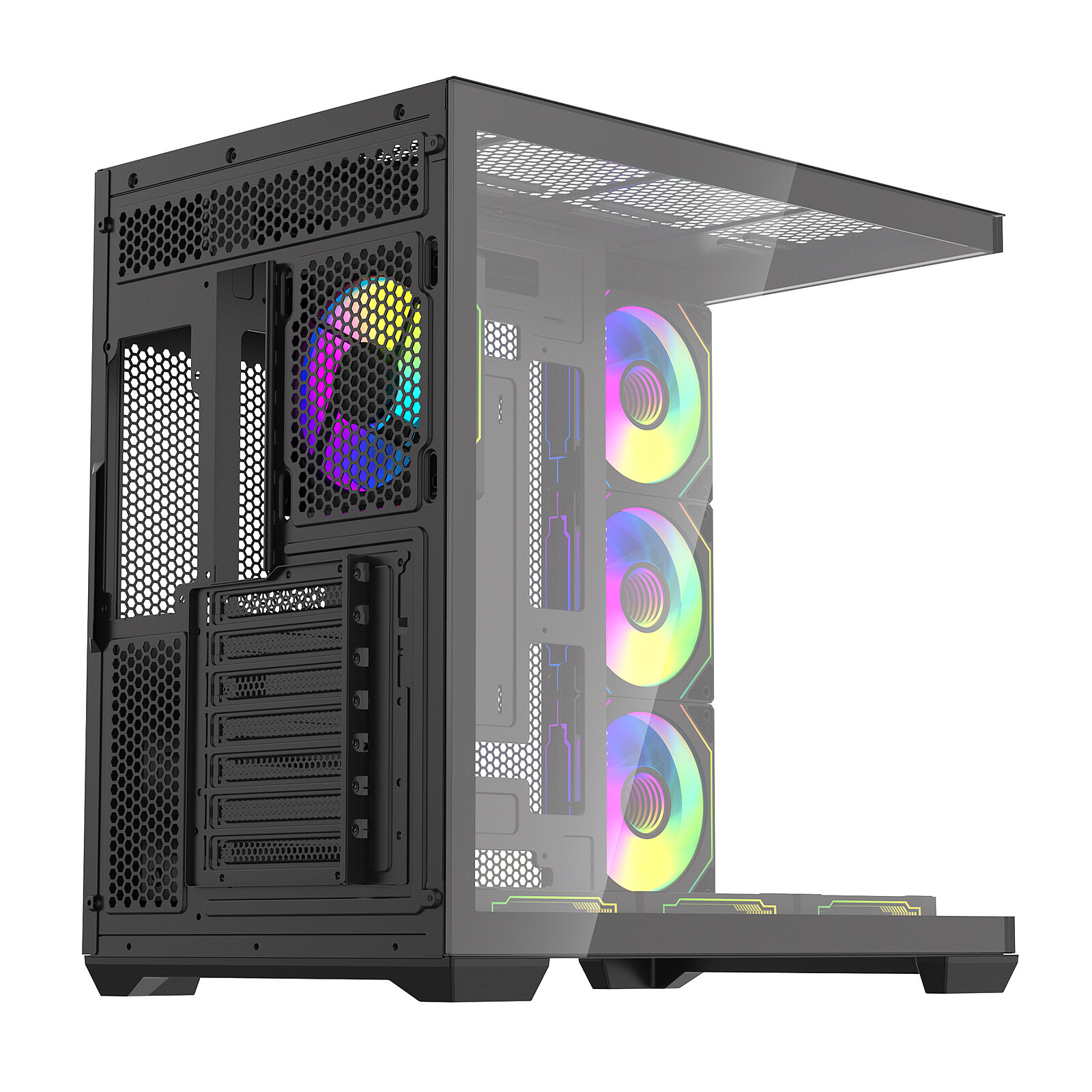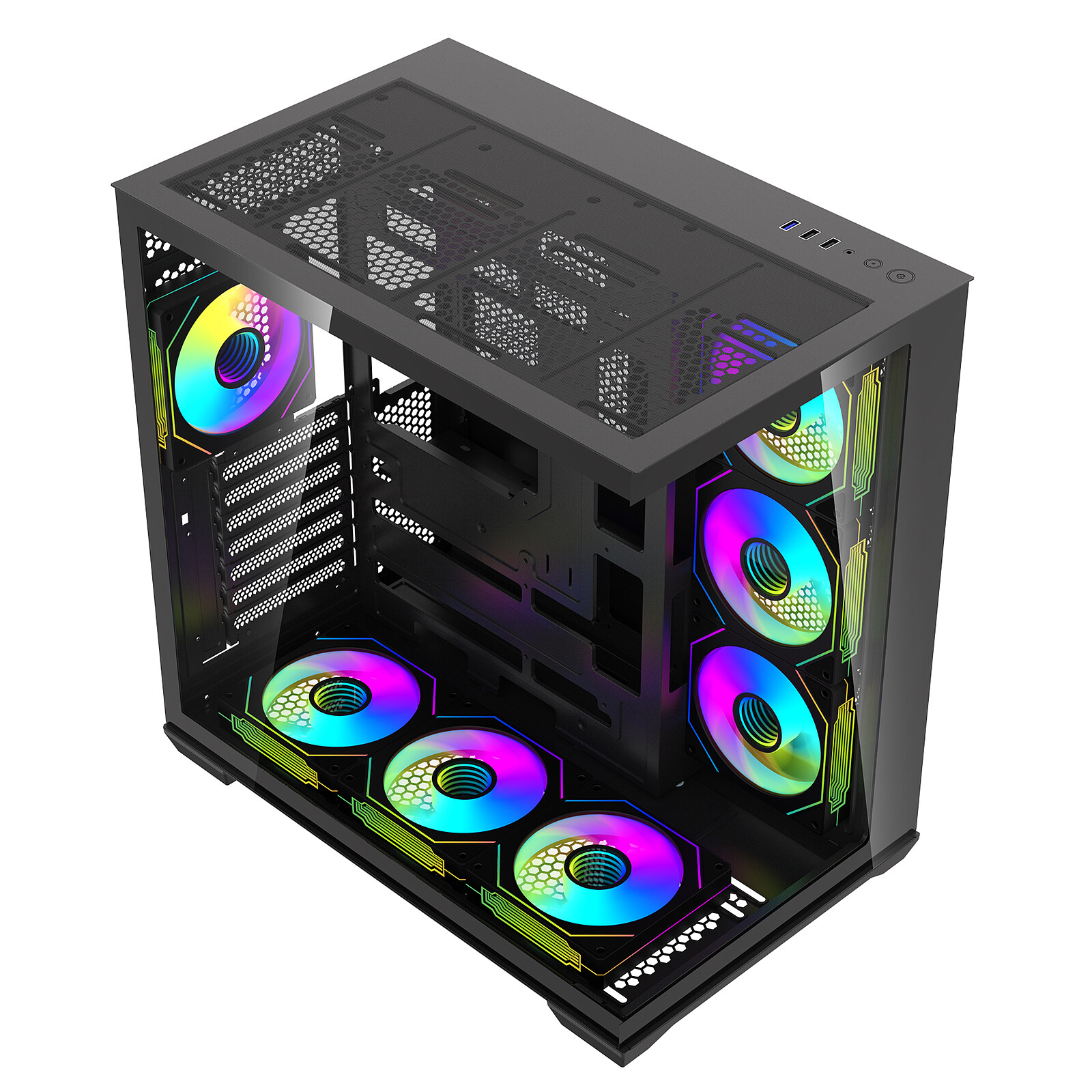 Latéral : 3 x 120 mm (3 x 120 mm reverse ARGB inclus) Arrière : 1 x 120 mm (1 x 120 mm ARGB inclus) Dessus : 3 x 120 mm ou 2 x 140 mm Dessous : 3 x 120 mm ou 2 x 140 mm (3 x 120 mm reverse ARGB inclus) |