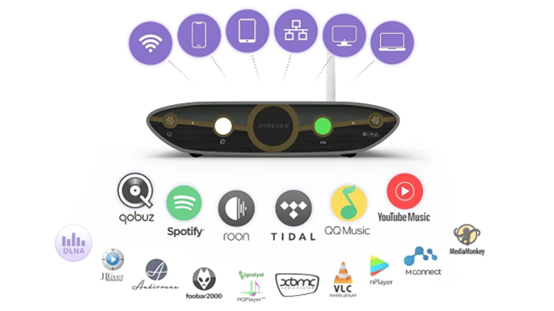 - Support natif des services : Spotify Connect, Tidal Connect, Qobuz Connect, AirPlay, Roon, DLNA