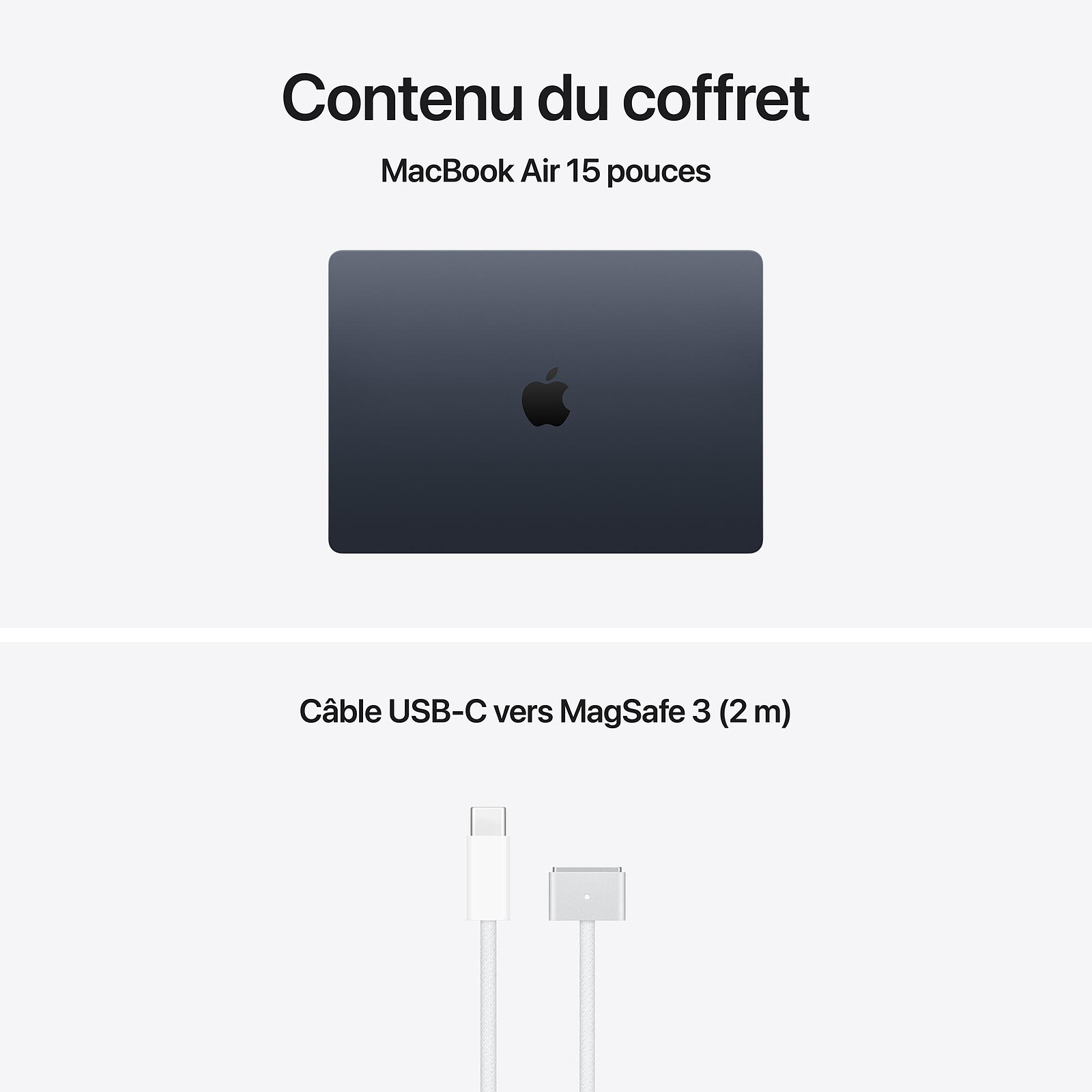 - ADAPTATEURS SECTEUR – Veuillez noter que le MacBook Air (15 pouces) est livré avec un câble de charge USB C vers MagSafe 3, mais sans adaptateur secteur. Un adaptateur secteur USB C ou une autre source d’alimentation USB PD capable de fournir 35 W (ou plus) est nécessaire pour recharger cet appareil. Pour une recharge optimale, Apple recommande d’associer ce Mac à l’Adaptateur secteur double port USB C 35 W ou à l’Adaptateur secteur USB C 70 W pour profiter de la charge rapide (jusqu’à 50 % de charge en 30 minutes)6.
