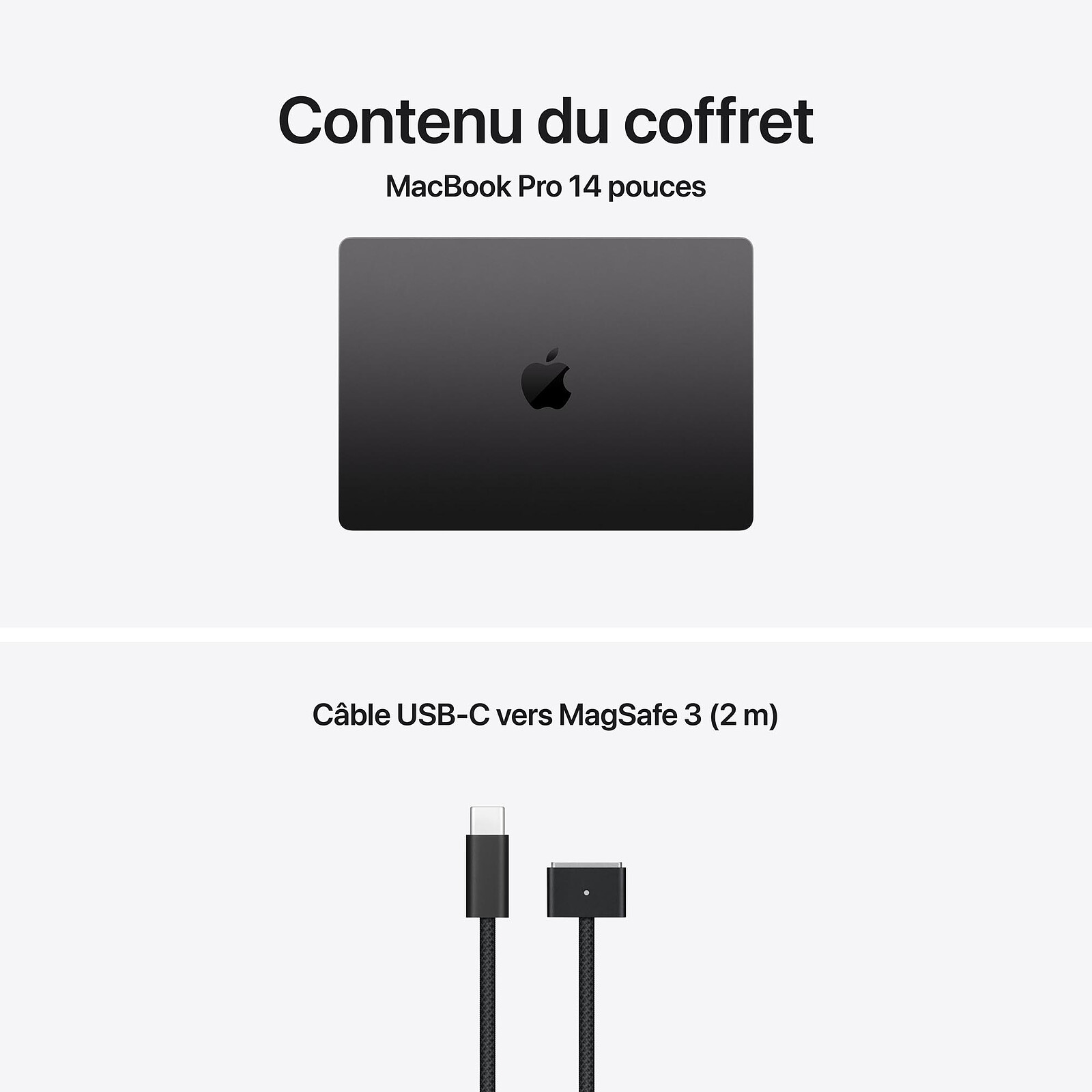 - ADAPTATEURS SECTEUR – Veuillez noter que le MacBook Pro (14 pouces) avec M5 Pro ou M5 Max est livré avec un câble de charge USB C vers MagSafe 3, mais sans adaptateur secteur. Un adaptateur secteur USB C ou une autre source d’alimentation USB PD capable de fournir 70 W (ou plus) est nécessaire pour recharger cet appareil. Pour une recharge optimale, Apple recommande d’associer ce Mac à l’Adaptateur secteur USB C 70 W ou à l’Adaptateur secteur USB C 96 W pour profiter de la charge rapide (jusqu’à 50 % de charge en 30 minutes)8.