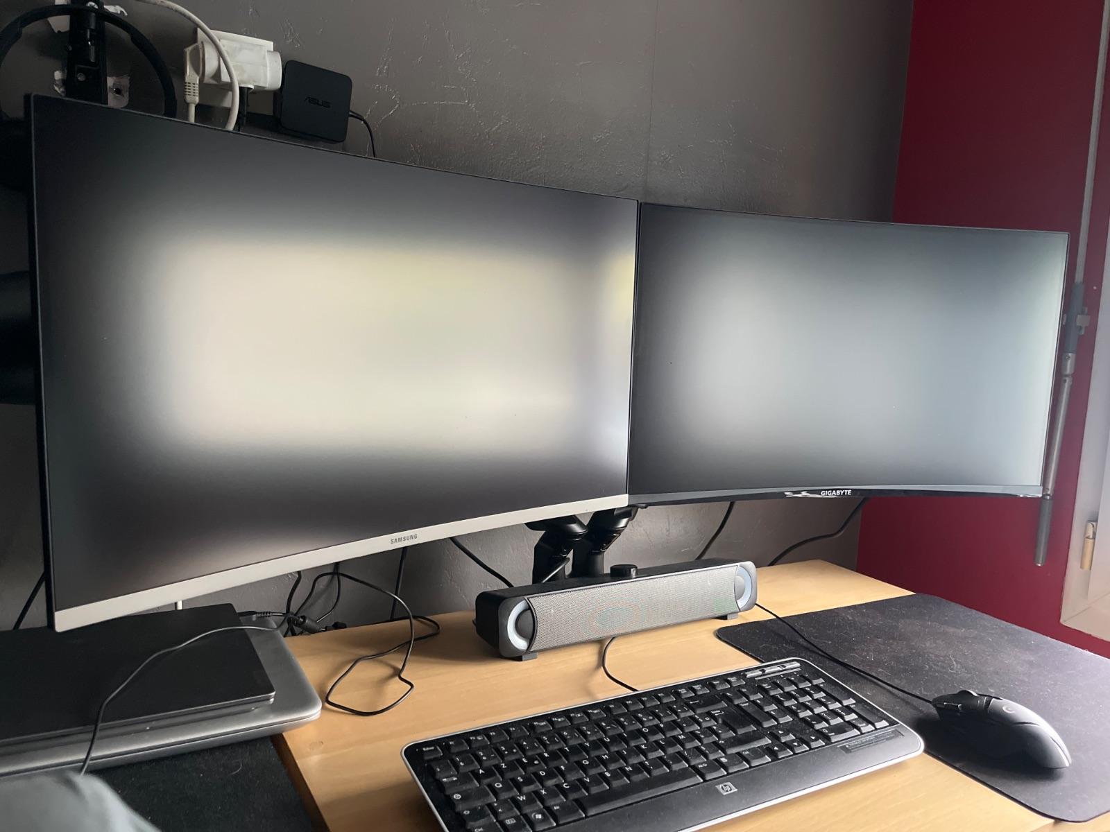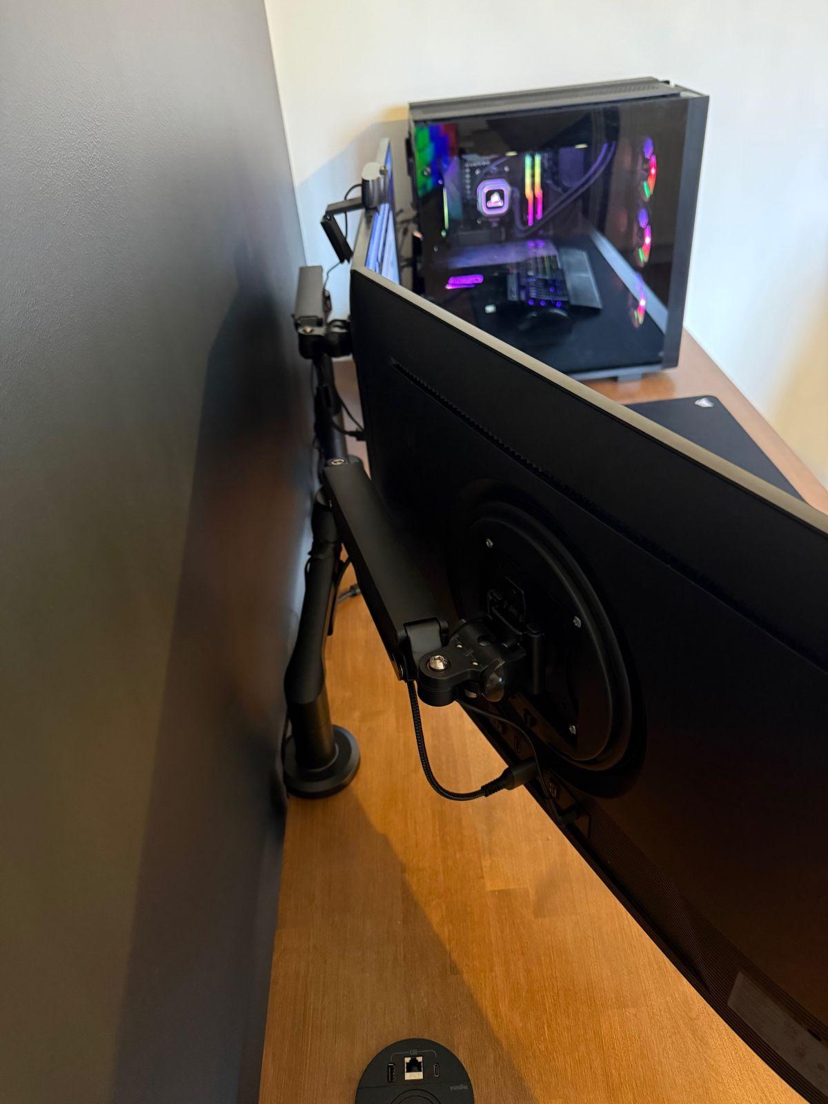 Acheté en deux exemplaires pour deux écrans 27" Odyssey G5 (plus flexible que un support double), ces supports prennent peu de place (bureau placé contre le mur), sont solides et très esthétiques sur un bureau sans câbles apparents. Je recommande.