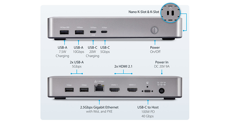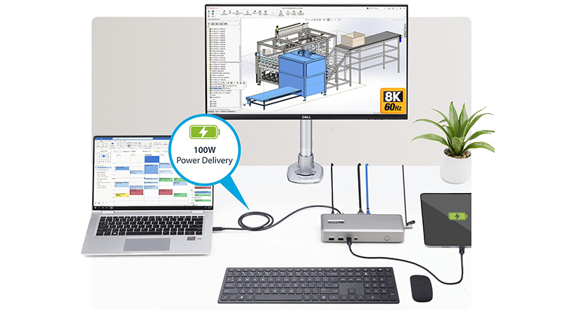 La station d'accueil est équipée de l'USB4 qui offre des vitesses de transfert de données de 40 Gbps et une bande passante améliorée pour la vidéo, faisant de ce dock une solution idéale pour l'informatique hautes performances et la connectivité. Les 2 ports HDMI 2.1 prennent en charge le Dual 4K 60Hz ou jusqu'au Dual 4K 120Hz / Single 8K 60hz à 4:2:2. Cette station d'accueil fournit des performances GPU directes sans logiciel ni compression.