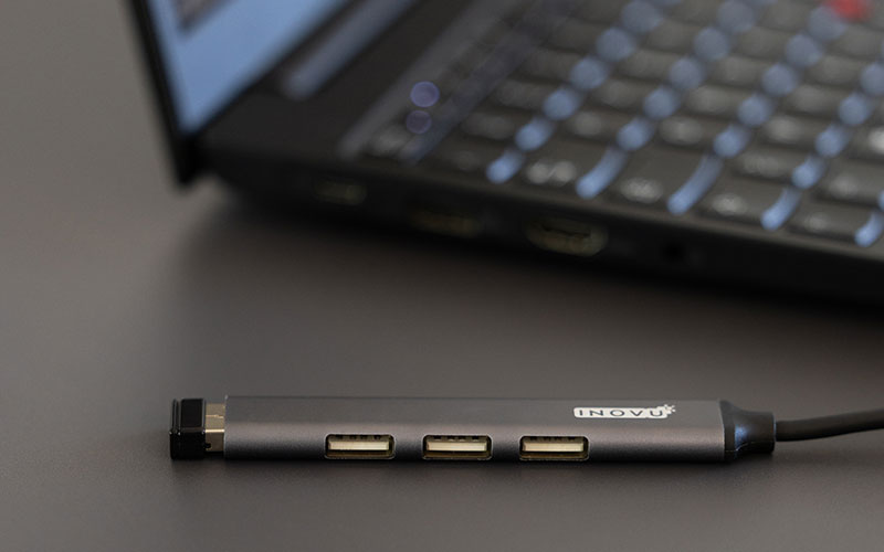 L'INOVU INHUB4A2 est un Hub USB compact et léger, ultra-discret et facile à transporter. Il se connecte en USB 3.0 et propose 3 ports USB 2.0 (480 Mbps) + 1 port USB 3.0 (5 Gbps). Conçu en alliage d'aluminium, il est ultra-léger (seulement 24 gr) et robuste.