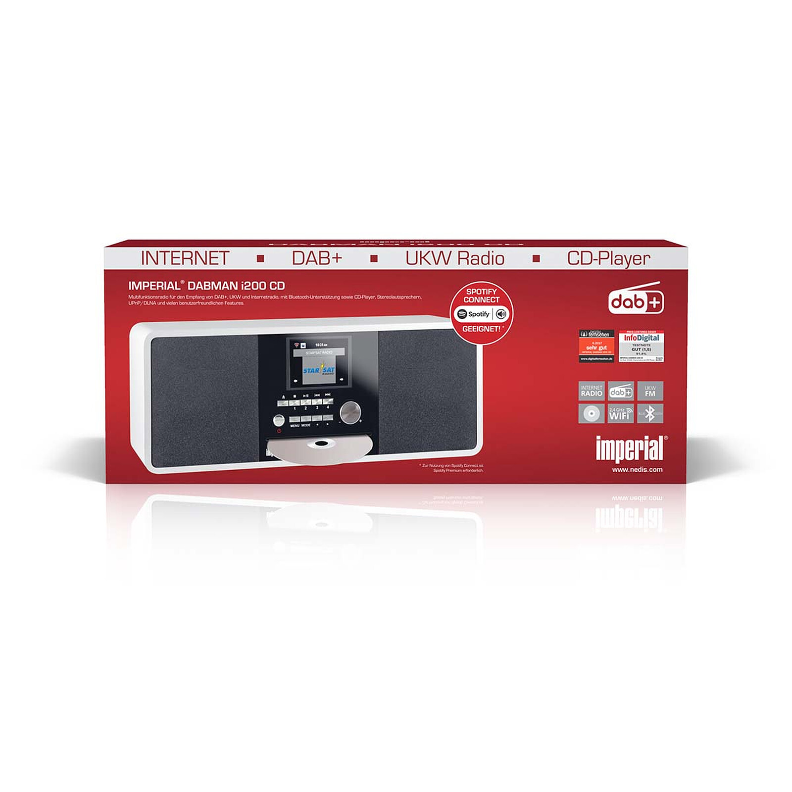 Vous aimez tant écouter la radio ou votre musique préférée chez vous ? Avec l'Imperial Dabman i200 CD, vous êtes paré à toutes les éventualités : ce système audio stéréo est idéal pour la réception de la radio DAB+ et FM. Il peut accéder à plus de 25 000 stations de radio Internet et dispose d'un lecteur CD MP3 intégré pour la lecture de musique au format CD. Equipé deux haut-parleurs de 3", parfaitement intégrés, le système audio Dabman i200 CD, produit un son stéréo volumineux qui peut être adapté aux préférences d'écoute individuelles grâce à différents réglages de l'égaliseur. L'interface UPnP permet la mise en réseau avec les appareils correspondants du réseau domestique, et l'interface Bluetooth intégrée facilite la diffusion de musique à partir de téléphones portables et de tablettes. La lecture des derniers hits et des artistes préférés via Spotify est également prise en charge grâce à Spotify Connect. D'autres fonctions conviviales telles qu'un assistant d'installation, une fonction d'alarme et la mémoire de plusieurs stations complètent la gamme de fonctions de cet ingénieux Dabman i200 CD.