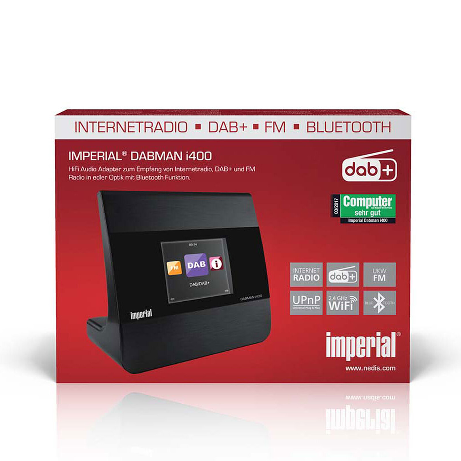 L'Imperial Dabman i400 est un adaptateur compact qui vous permet de recevoir la radio numérique DAB+, la radio Internet et la radio FM analogique. Il peut également être utilisé comme récepteur de musique à partir de disques durs en réseau (via UPnP/DLNA), de clés USB ou de smartphones et de tablettes PC connectés via Bluetooth. Le Dabman i400 prend en charge le multiroom (lecture simultanée de fichiers radio ou musicaux dans différentes pièces via LAN/Wi-Fi), peut être connecté à un lecteur de CD externe via USB (lecteur de CD USB) et peut être contrôlé confortablement à distance à l'aide de la télécommande (fournie) ou de l'application (gratuite) pour smartphone (AirMusic Control). L'égaliseur intégré offre 6 réglages sonores différents, le grand écran couleur de 3,2" affiche des informations de fond sur le programme en cours ainsi que les données météorologiques actuelles.