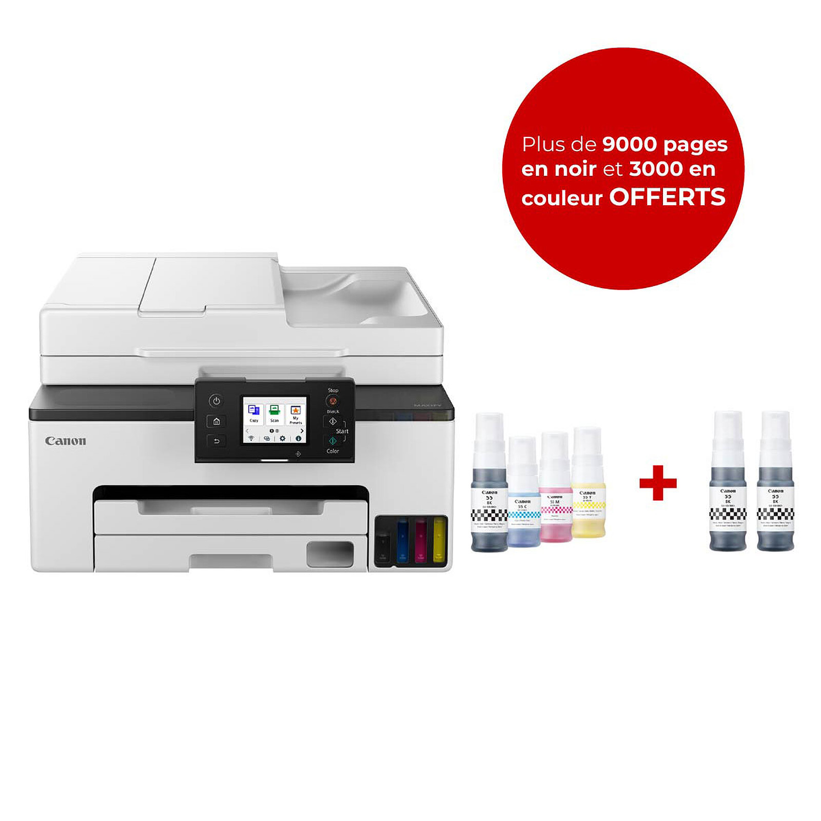 4-en-1 (impression, copie, numérisation et fax), l'imprimante MegaTank MAXIFY GX2050 de Canon vous permet de vivre toute l'expérience du bureau à domicile dans un format compact. Simple à prendre en main, elle vous permet de disposer d'une solution multifonction d'impression, de numérisation, et de copie. Ses vitesses d'impression sont de 15 ipm en noir et 10 ipm en couleur. Très pratique, elle intègre des réservoirs d'encre rechargeables à haut rendement pour répondre à toutes vos attentes. Ce modèle offre également une utilisation intuitive avec un écran LCD inclinable couleur de 2.7". Pour vous offrir toujours plus de possibilités, elle est dotée d'une connectivité Wi-Fi et Ethernet. Enfin, elle est aussi compatible avec l'impression mobile et le cloud.