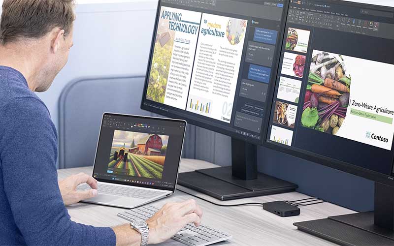 Donnez une nouvelle dimension à votre espace de travail avec la station d’accueil Microsoft Surface USB4. Avec ses vitesses de transfert de données ultra-rapides, ses options de port étendues pour les accessoires essentiels, son transfert d’alimentation jusqu’à 65W pour charger des appareils et sa prise en charge de deux moniteurs 4k, ce sera une solution idéale pour votre installation. Étendez ou dupliquez votre écran en connectant votre appareil USB4/Thunderbolt 4 à deux moniteurs 4k à 60 Hz via des ports USB-C ou HDMI 2.1, ou à un seul moniteur 8k à 30 Hz via un port USB-C.