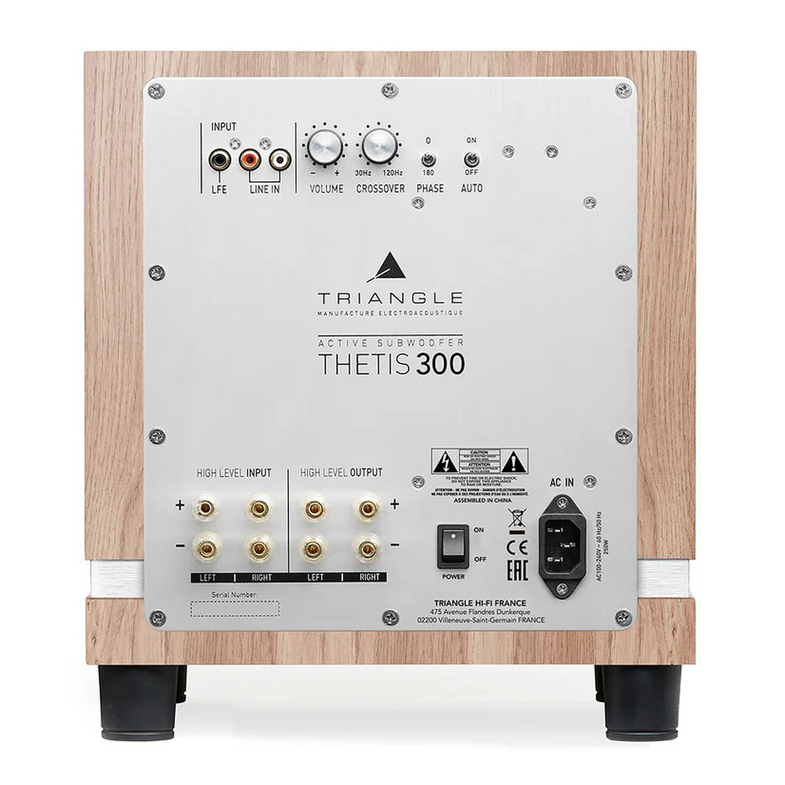 Le subwoofer Triangle Thetis 300 se montre polyvalent pour accompagner toutes vos envies. Ce modèle est équipé d’un haut-parleur de 20 cm à émission vers le sol, d’un amplificateur de 150W et d'une charge Bass-reflex pour conserver un volume restreint tout en offrant des performances surprenantes. Le Thetis 300 se dote de nombreuses entrées, permettant de l'associer à tous types d’amplificateurs. Il inclut une entrée LFE non filtrée, des entrées RCA et enfin des entrées "haut-niveau" pour les amplificateurs dépourvus de sortie adaptée. Différents réglages sont disponibles, tels que l’ajustement du volume, de la fréquence de coupure et de la phase, permettant un ajustement optimal avec vos enceintes principales. Enfin, il dispose d’une mise en veille / sortie de veille automatique.