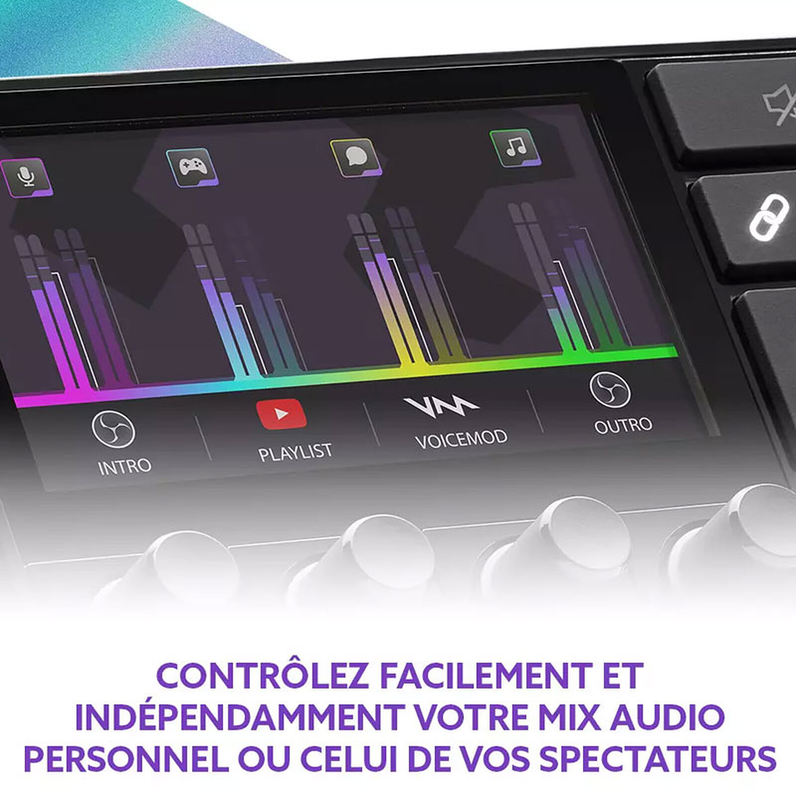 L'Hercule Stream 200 XLR met à votre disposition 4 encodeurs de gestion des niveaux de volume (avec fonction de coupure du son) mais aussi 2 pages de 4 pistes chacune. Le bouton de gestion des pages, l'encodeur de volume du casque, et le bouton de coupure du son de toutes les pistes, vous permettent d'avoir totalement le contrôle sur le son de votre session de stream. L'Hercule Stream 200 XLR permet aussi la gestion audio depuis d’autres appareils (console de jeu, deuxième ordinateur, etc.). Avec 2 x 2 vumètres stéréo pour chaque piste, un bouton pour passer du mix créateur au mix audience et un bouton pour lier le contrôle des volumes, c'est bien vous qui avez la main sur vos créations.