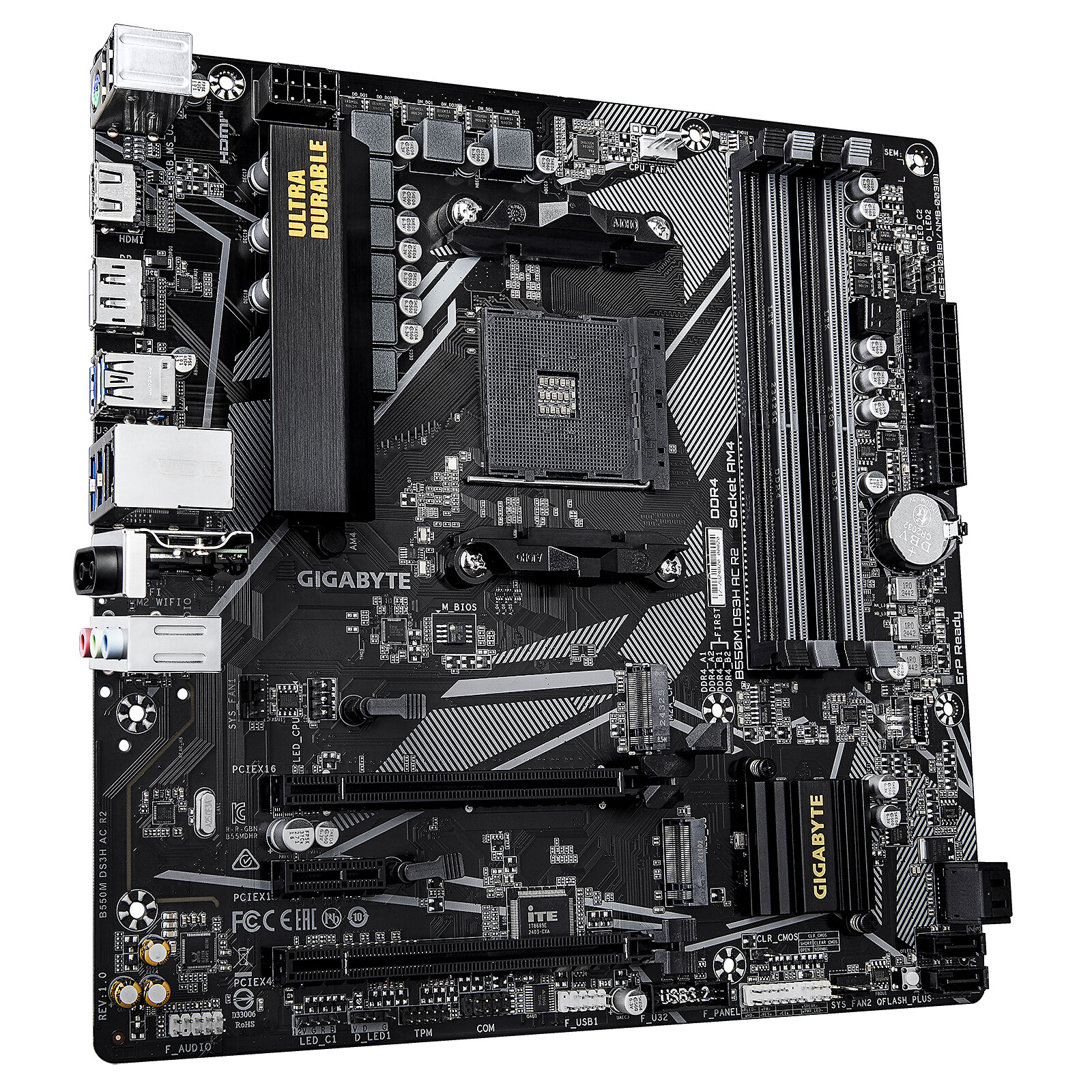 La carte mère Gigabyte B550M DS3H AC R2 sera parfaite pour assembler une machine polyvalente, adaptée au travail et au divertissement. Conçue pour les processeurs AMD Ryzen 3000/4000G/5000 sur socket AMD AM4, elle prend en charge jusqu'à 128 Go de DDR4, les cartes graphiques bénéficiant de la norme PCI-Express 4.0 et aussi les disques durs et SSD au format SATA (6 Gbit/s) et M.2 (SATA et PCIe 4.0 x4).