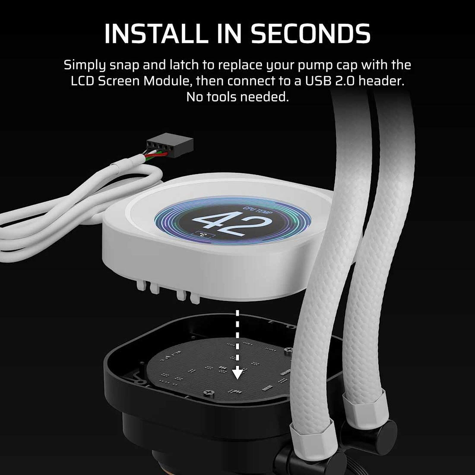 Avec le module d'écran LCD NAUTILUS RS de Corsair, affichez la température du processeur, des GIF animés, des mêmes ou le logo de votre équipe sur un écran IPS 480 x 480 d'une grande netteté. Ce module dispose d'un écran IPS à 30 FPS avec un rétroéclairage ultra lumineux de 600 cd/m² et offre plus de 16,7 millions de couleurs. Le logiciel iCUE comprend une intégration GIPHY complète dans l'application, vous donnant accès à des milliers de vos mêmes et GIFs préférés. Simple à installer, ol suffit de déclipser/clipser pour remplacer le capuchon de la pompe par le module d'écran LCD, puis de le connecter à un connecteur USB 2.0 de votre carte mère. Aucun outil n'est nécessaire.