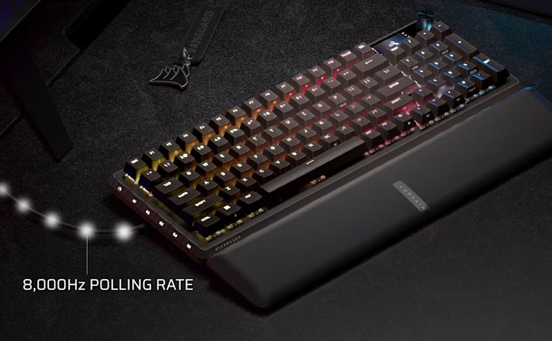 Le Vanguard Pro 96 embarque des switchs magnétiques Corsair MGX Hyperdrive, capables d’offrir des points d’actionnement dynamiques, avec réinitialisation sans mouvement mécanique — ce qui réduit les latences. Il peut atteindre un taux d’interrogation de 8 000 Hz, garantissant que vos frappes sont transmises avec une rapidité extrême (un avantage dans les jeux compétitifs). Grâce à la technologie Rapid Trigger, chaque pression est détectée instantanément, sans attendre une réinitialisation physique complète du switch.