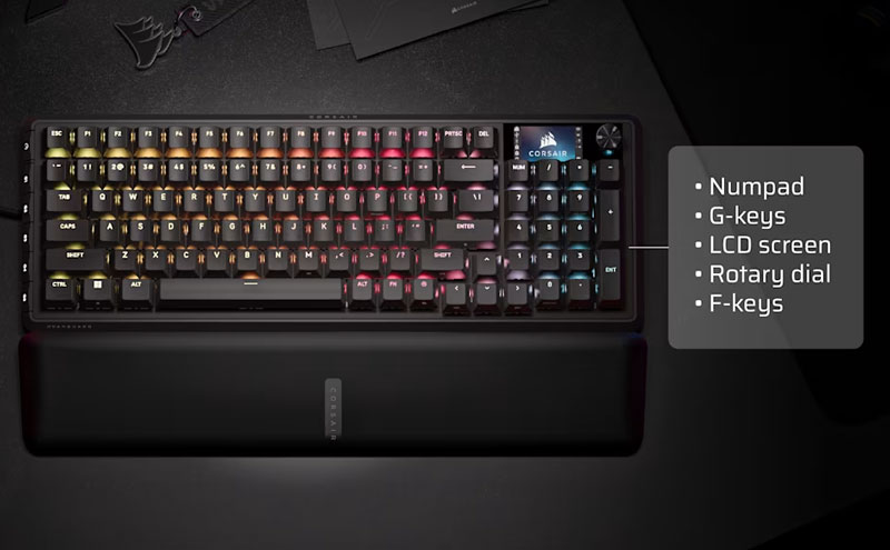On retrouve aussi 6 touches G programmables à profil bas, une molette rotative multifonctionnelle, une molette toast et une touche de lancement du Stream Deck virtuel (Elgato). Le tout est pilotable via Corsair Web Hub, sans installation de logiciel compliqué, pour une personnalisation fluide et accessible.