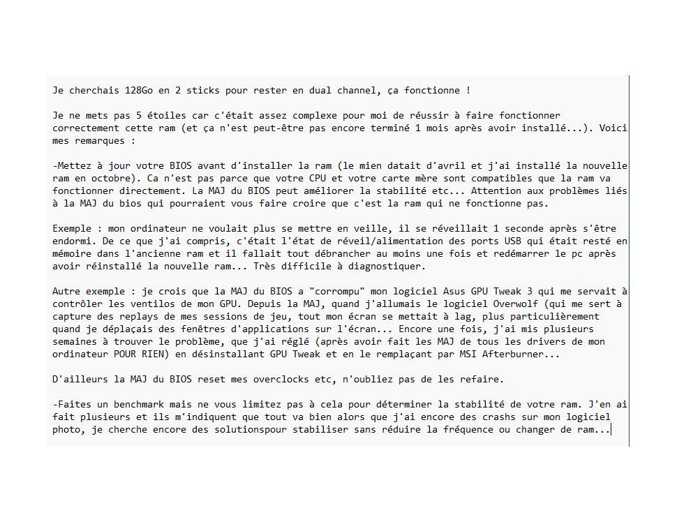 Je ne mets pas 5 étoiles car c'était assez complexe pour moi de réussir à faire fonctionner correctement cette ram (et ça n'est peut-être pas encore terminé 1 mois après avoir installé...).