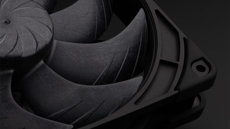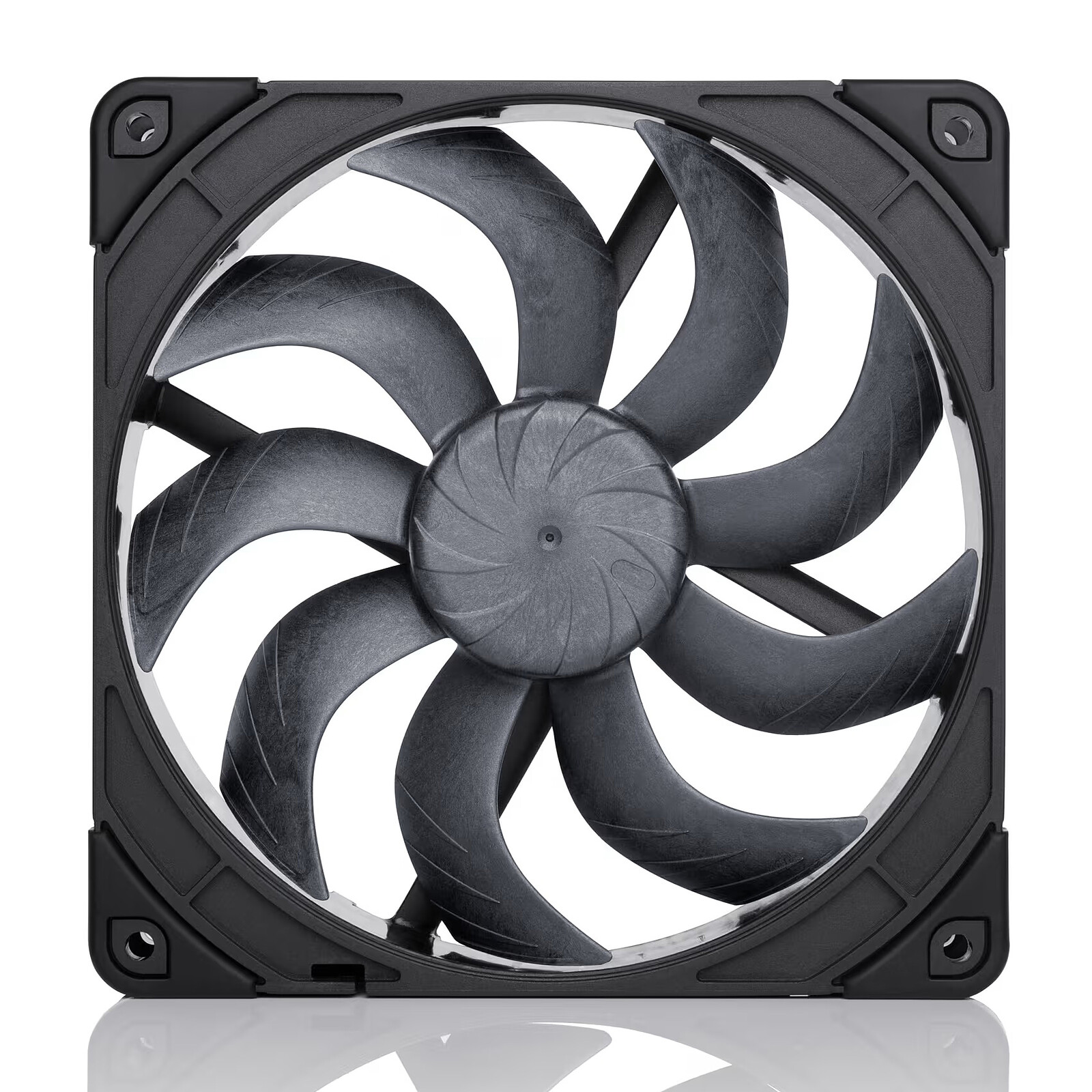 - Le NF-A14x25 G2 est pourvu d’une turbine Progressive-Bend (design à courbure progressive) dotée de Flow Acceleration Channels et de winglets. Ses 9 pales, plutôt orientées en arrière côté moyeu, se courbent progressivement vers l’extérieur en bout de pale. Combiné au moyeu Centrifugal Turbulator, une telle conception permet d’acheminer plus d’air en bout de pale (zone d’efficacité maximale) et assure aussi une charge mieux répartie tout au long du profil des pales.