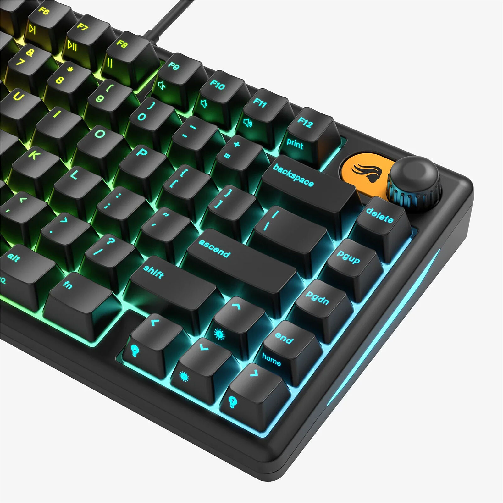 Son rétroéclairage RGB à 10 zones illumine le setup avec de nombreux effets personnalisables via le logiciel Glorious CORE (sous Windows), tandis que le bouton rotatif dédié permet de contrôler rapidement le volume.