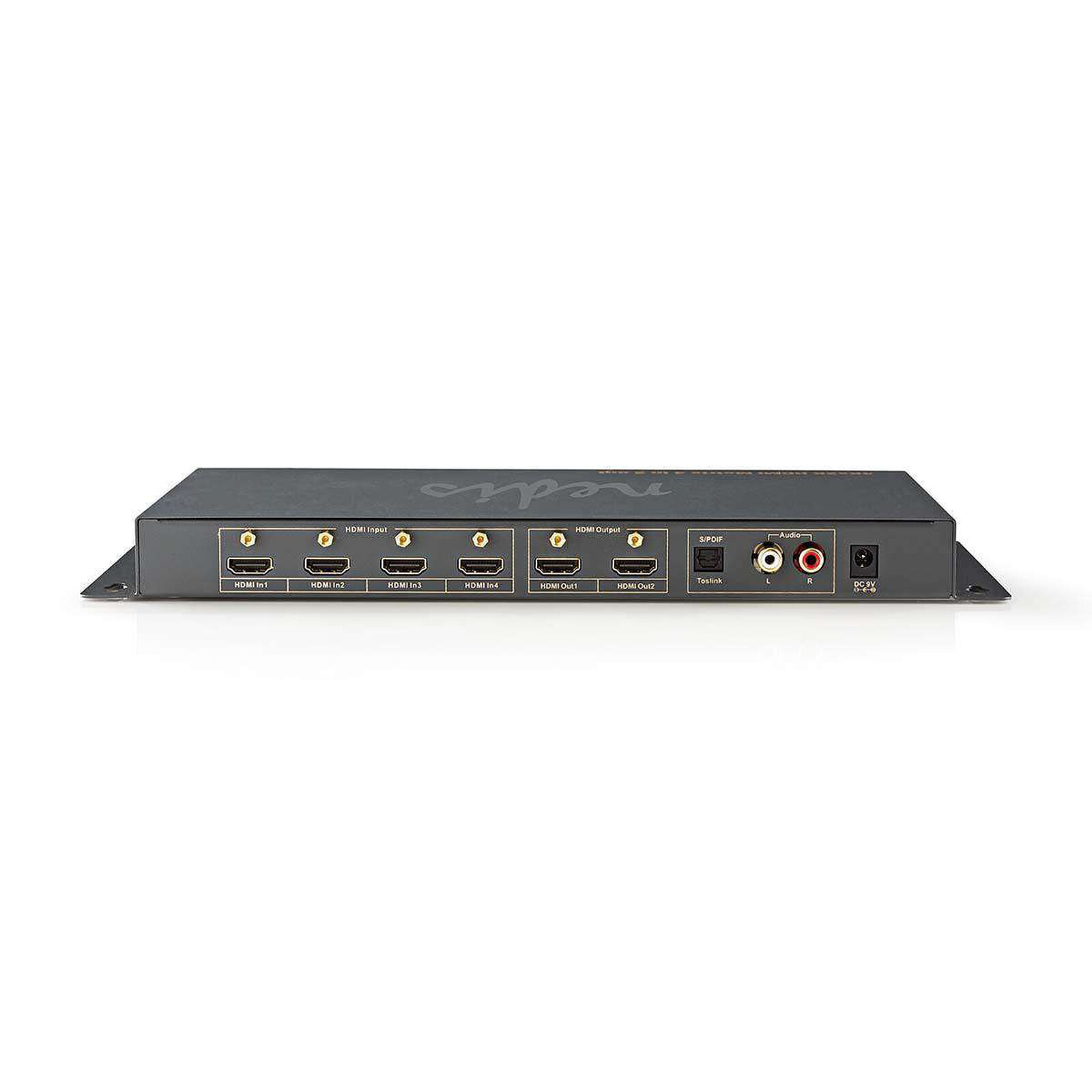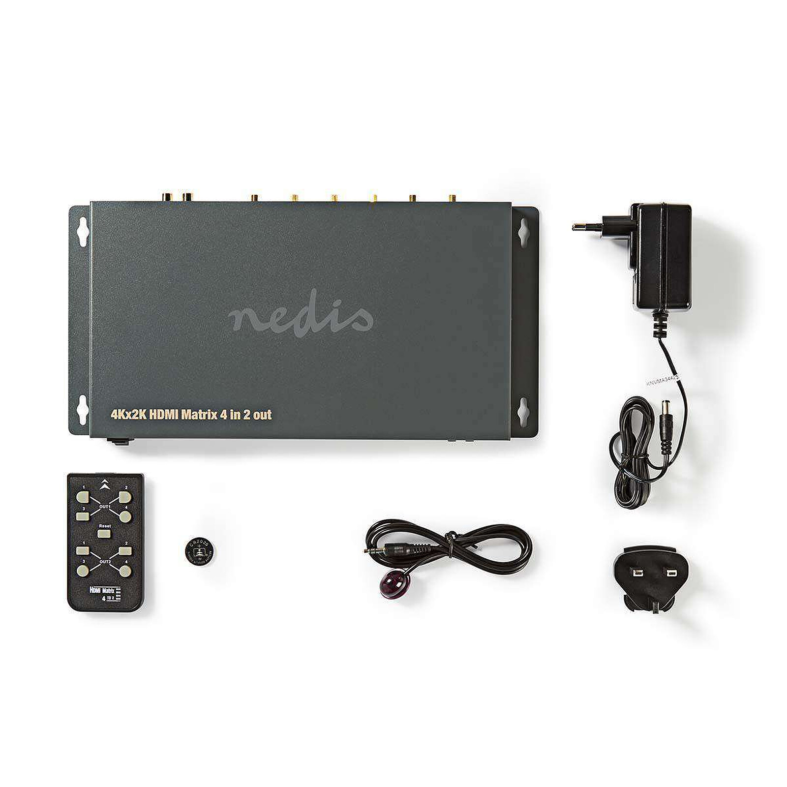 Le commutateur matriciel HDMI 4K 4x2 de Nedis vous permet de connecter jusqu'à 4 appareils avec une sortie HDMI vers 2 TV, moniteurs ou projecteurs indépendamment les uns des autres et sans avoir à changer de câble, par télécommande. Ce commutateur matriciel est également doté d'une sortie audio analogique (RCA stéréo 2RCA) et d'une sortie audio numérique (optique Toslink). Vous pouvez le contrôler à l'aide du bouton-poussoir situé à l'avant ou de la télécommande infrarouge et choisir le périphérique que vous souhaitez voir sur l'écran de votre choix.
