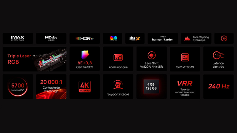 Vidéoprojecteur Triple Laser RGB DLP - 4K Ultra HD - 3D Ready - HDR10+/Dolby Vision - IMAX - 5700 Lumens - Autofocus - Google TV - Wi-Fi/Bluetooth - HDMI/USB - Son Harman/Kardon 2 x 12 W Dolby Audio