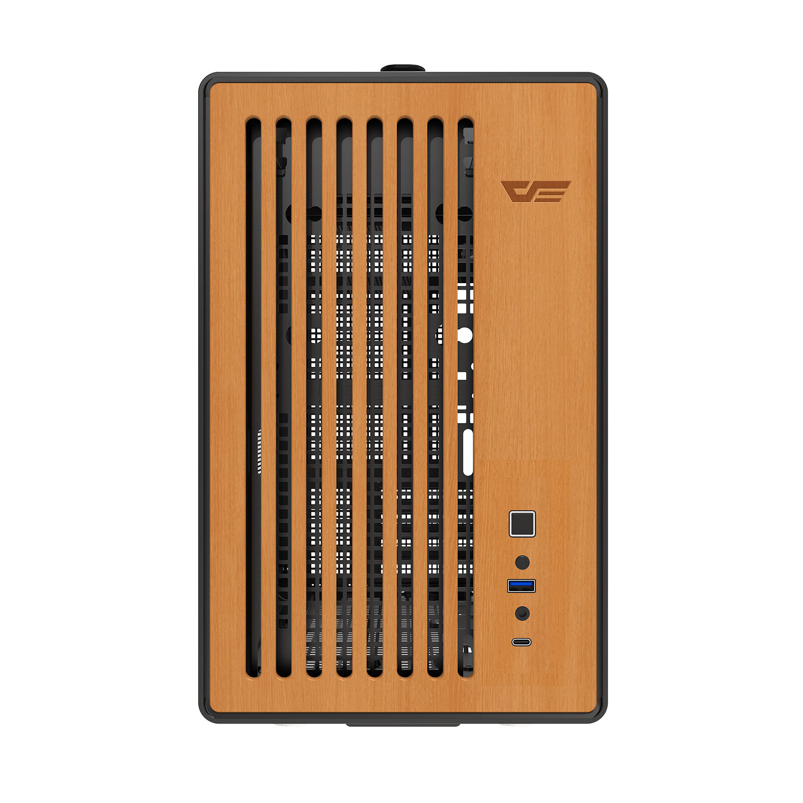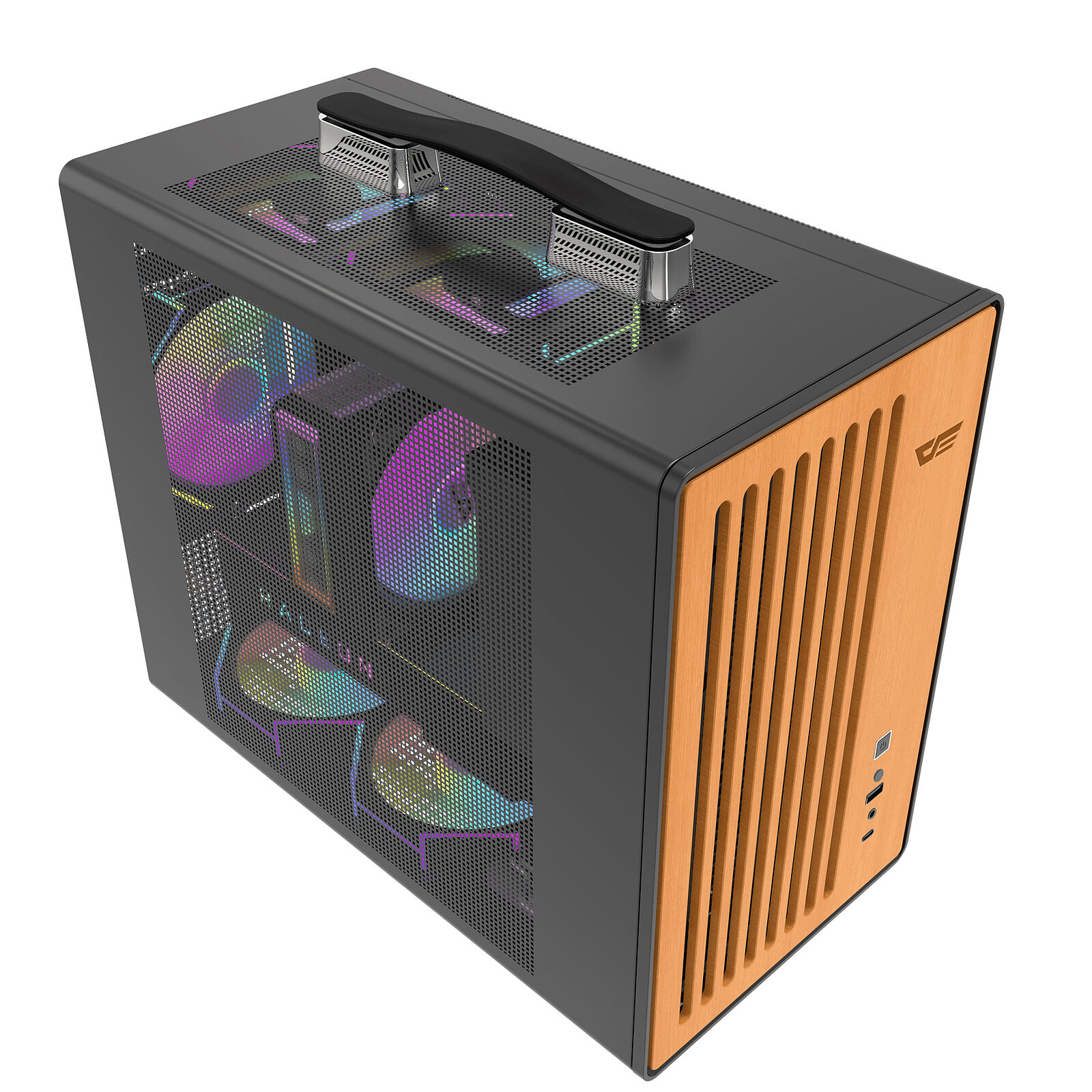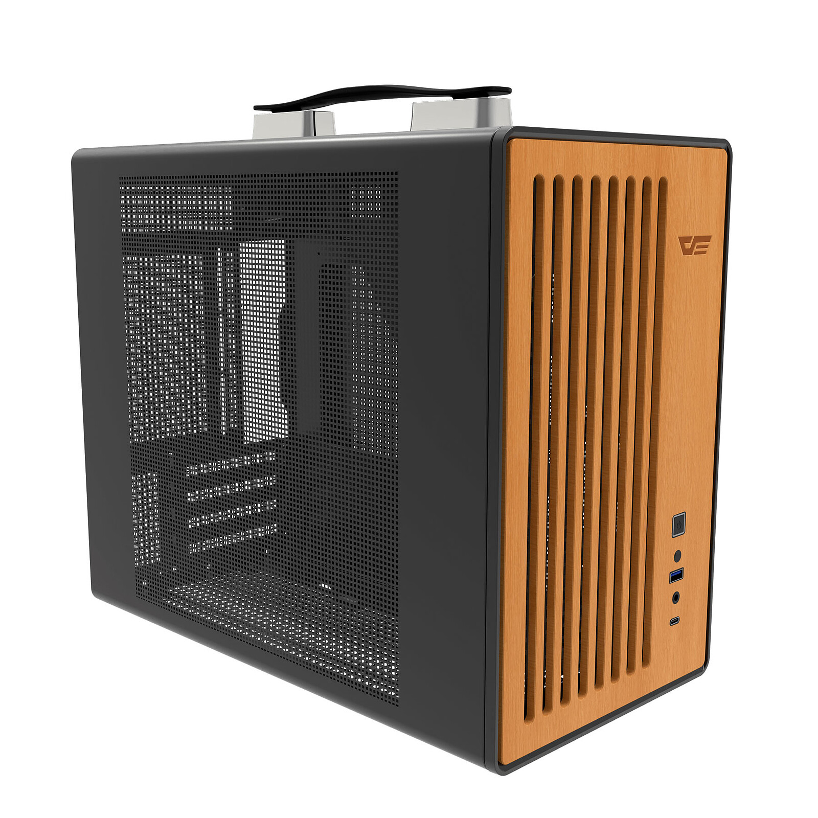 Le darkFlash WD200 est un boîtier compact conçu pour faciliter le transport et offrir une installation simple des composants. Sa poignée intégrée permet de le déplacer aisément, tandis que sa façade en placage bois de 5 mm apporte robustesse et résistance à l’humidité. La structure interne segmentée améliore l’accès à l’alimentation et simplifie l’intégration d’un modèle haut de gamme.