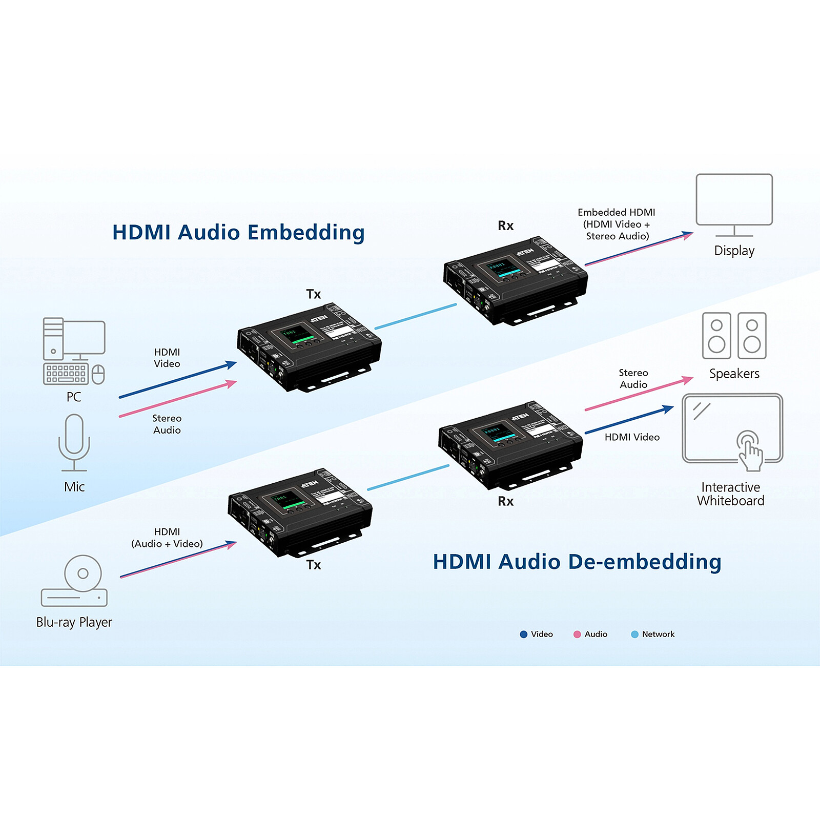 - Étend les connexions AV d'une configuration simple point à point à une configuration multipoint à multipoint sur une distance maximale de 100 mètres (point à point)