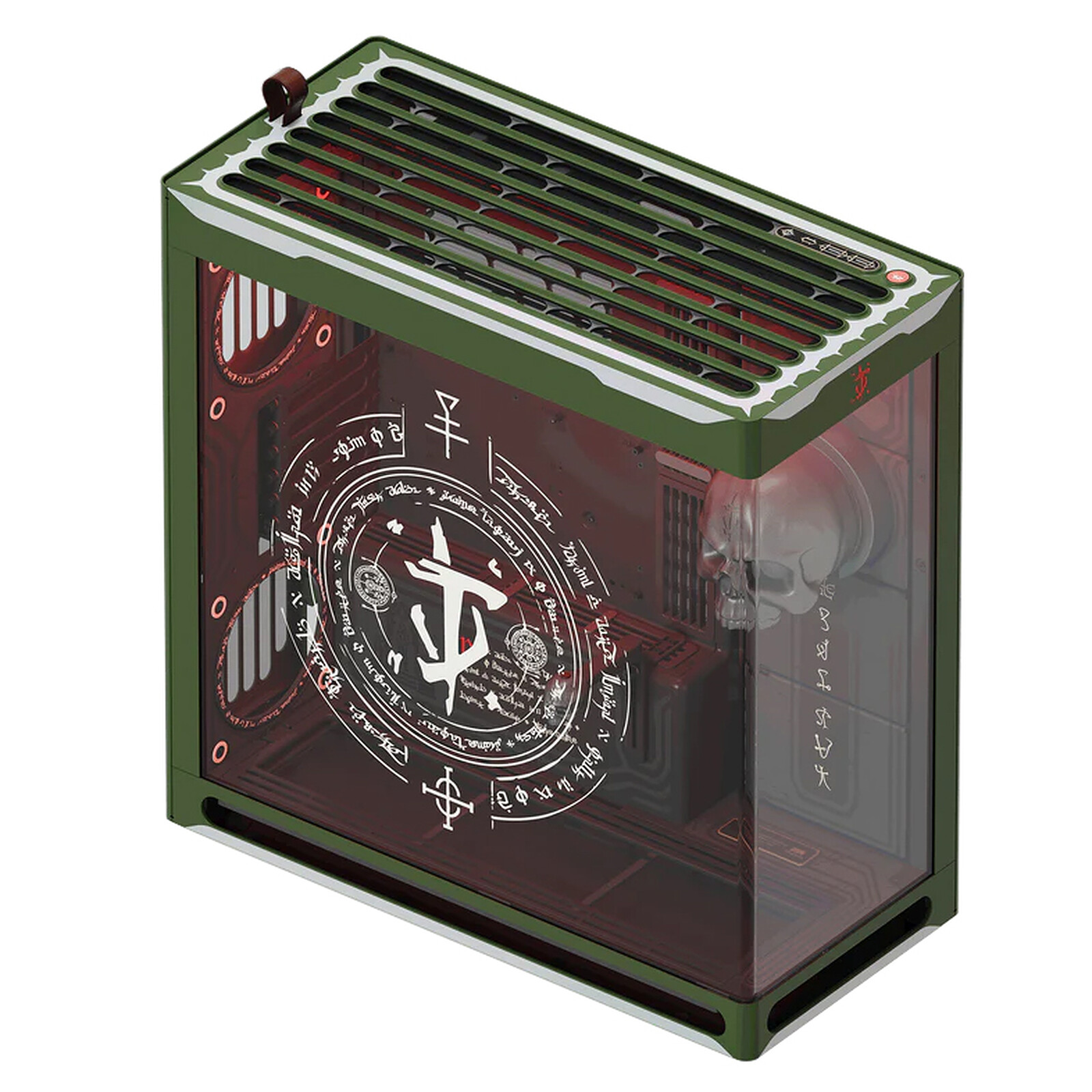 • Impression multicouche aux couleurs de DOOM : L’extérieur est de la même couleur verte que l'armure du DOOM Slayer. Le chassis est rehaussé de détails métalliques évoquant l’armure Praetor Suit, tandis que le panneau en verre trempé UniSheet et les surfaces intérieures présentent des sigils et des runes blancs sérigraphiés multicouches.