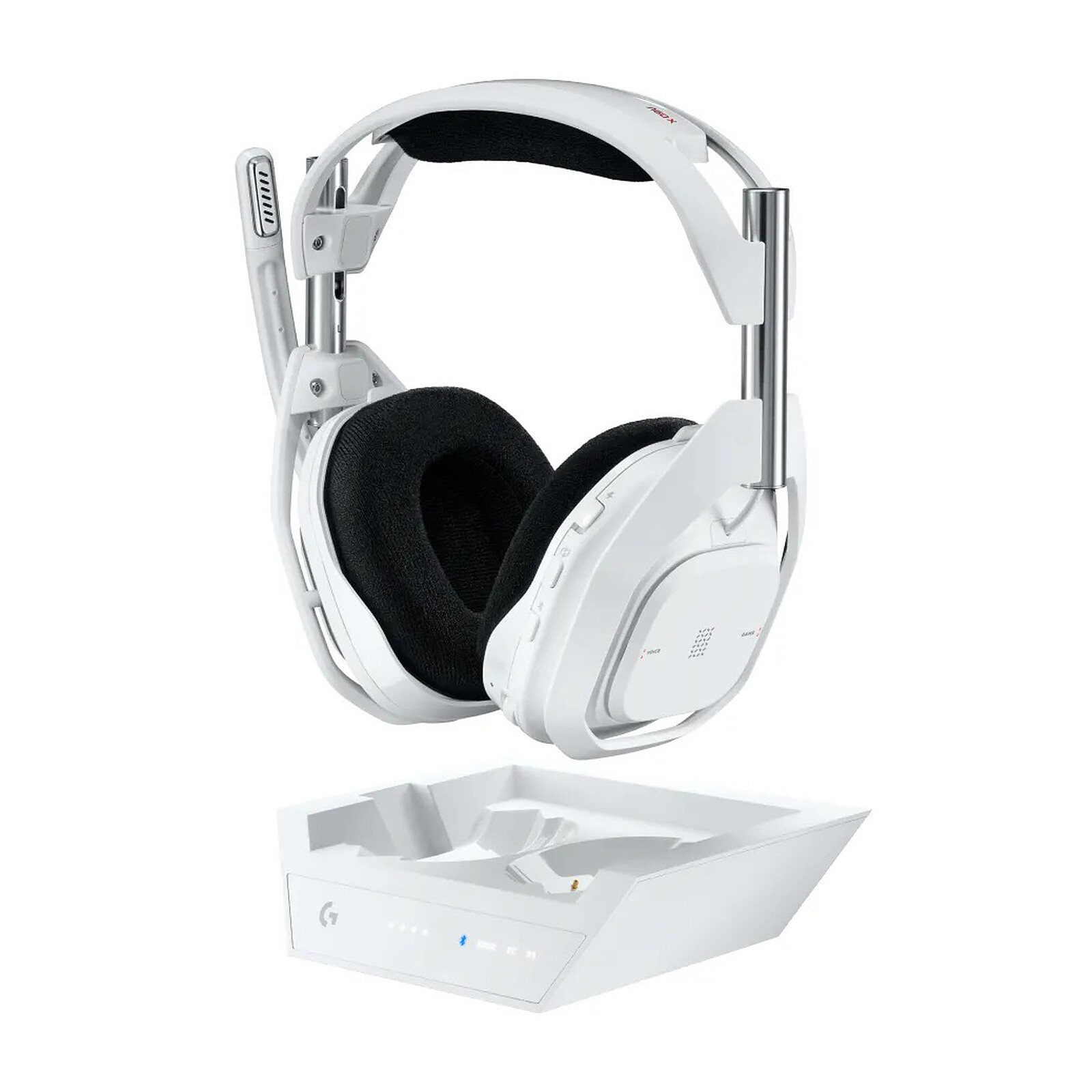 Le casque premium gaming Logitech G A50 X + Base Station est optimisé pour les joueurs multi-systèmes qui recherchent l'expérience de jeu la plus transparente. Le socle de charge magnétique à encliqueter garantit que l'A50 X est toujours chargé et prêt à jouer. Il suffit de le retirer de la station de base pour qu'il se connecte automatiquement à vos appareils jusqu'à une distance de 12 mètres. Il suffit de le réinsérer dans le berceau toujours actif lorsque c'est l'heure de la pause. Le panneau d'information sur l'état des LED vous indique l'autonomie restante de votre batterie de 24 heures, ainsi que le système auquel vous êtes actuellement connecté.